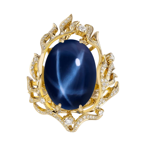 В центре композиции - звёздчатый сапфир весом 34,59 карата, привезённый из Таиланда. Самоцветы этого происхождения известны ярко выраженным эффектом астеризма : при попадании направленного света на гладко отполированную поверхность камня проявляется чёткая световая звезда. Это редкое оптическое явление возникает благодаря микроскопическим включениям рутила, ориентированным внутри кристалла. Именно оно создаёт ощущение глубины и визуального “погружения” взгляда в тёмно-синюю бездну минерала.