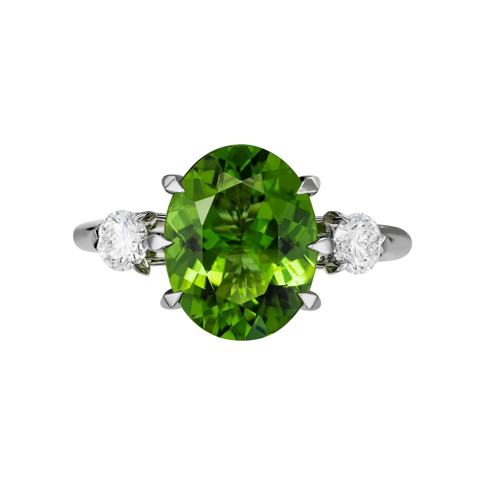 Благородная платина обрамляет центральный камень весом 3,79 карат, подчеркивая его насыщенность и позволяя свету проникать в глубину минерала. Бриллианты, расположенные рядом, играют роль световых акцентов – словно искры, отражающие ту энергию, которой самоцвет щедро делится с окружающим миром.