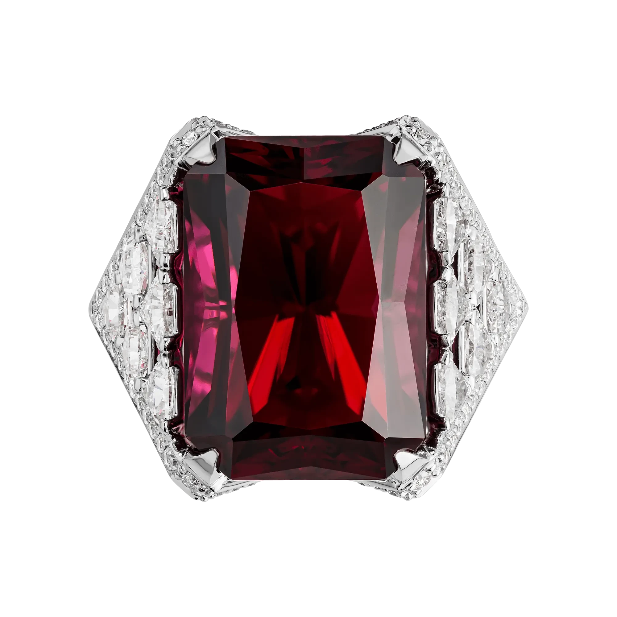 Оправа из белого золота выстроена как система поддерживающих конструкций. Треугольные элементы, инкрустированные бриллиантами, напоминают контрфорсы и арочные пролёты, формирующие декоративный ритм. Россыпь бриллиантов работает как световой рельеф, усиливая глубину центрального камня и подчёркивая архитектурную строгость всей формы.
