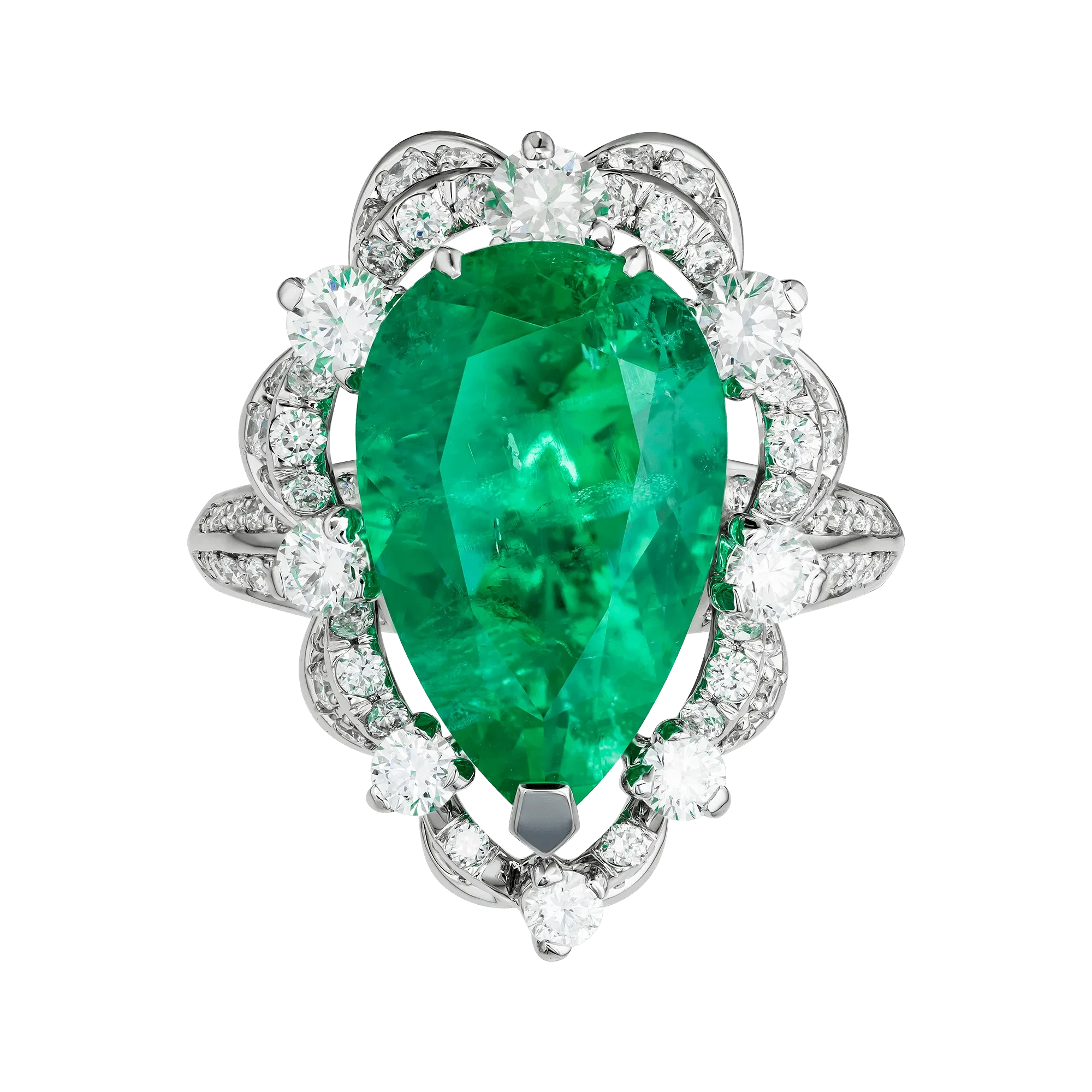 Каплевидная форма изумруда усиливает пластику оттенка и создаёт ощущение движения цвета. Белое золото и россыпь бриллиантов формируют светлую архитектуру вокруг драгоценного камня, подчёркивая его доминирование и оставляя ему пространство для визуального «дыхания». Кольцо воспринимается как ювелирная интерпретация живописного метода Веронезе, где цвет становится главным действующим элементом, а форма лишь усиливает его звучание.