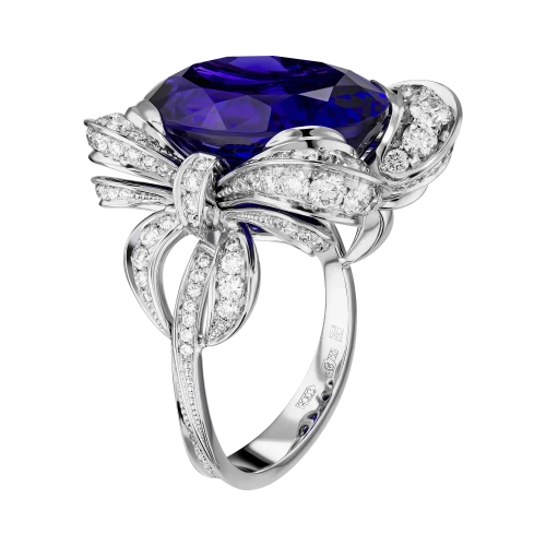 Два изящных банта из белого золота, расшитые бриллиантами, обрамляют самоцвет, подобно легкому жесту парижанки, которая умеет одним движением создать образ безупречной утончённости. Их воздушность придаёт композиции кокетливую мягкость и одновременно торжественность.