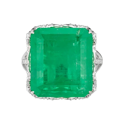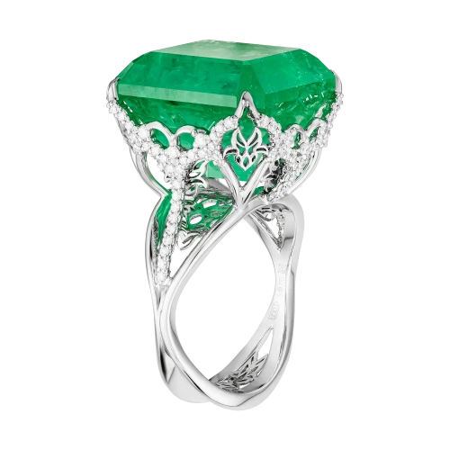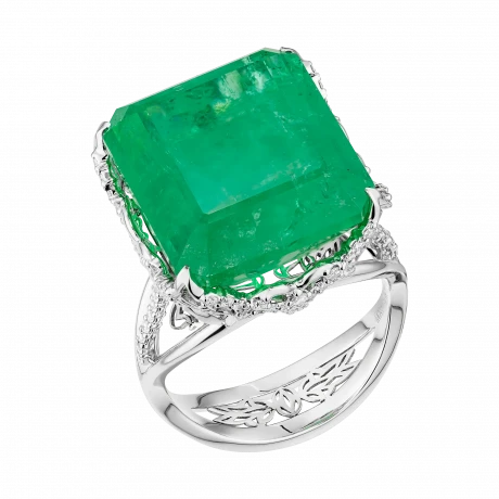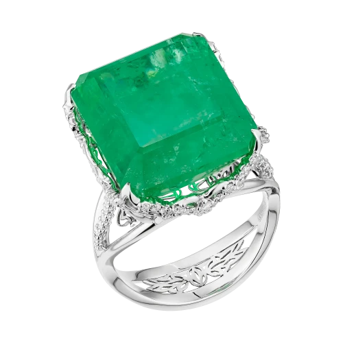 Кольцо «Первый оттенок» построено вокруг изумруда исключительного масштаба — камня, в котором цвет воспринимается как момент рождения. Этот оттенок не статичен, а словно появляется из глубины, напоминая самый первый зелёный тон, возникающий в природе после долгой тишины.