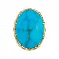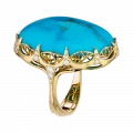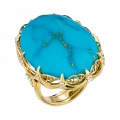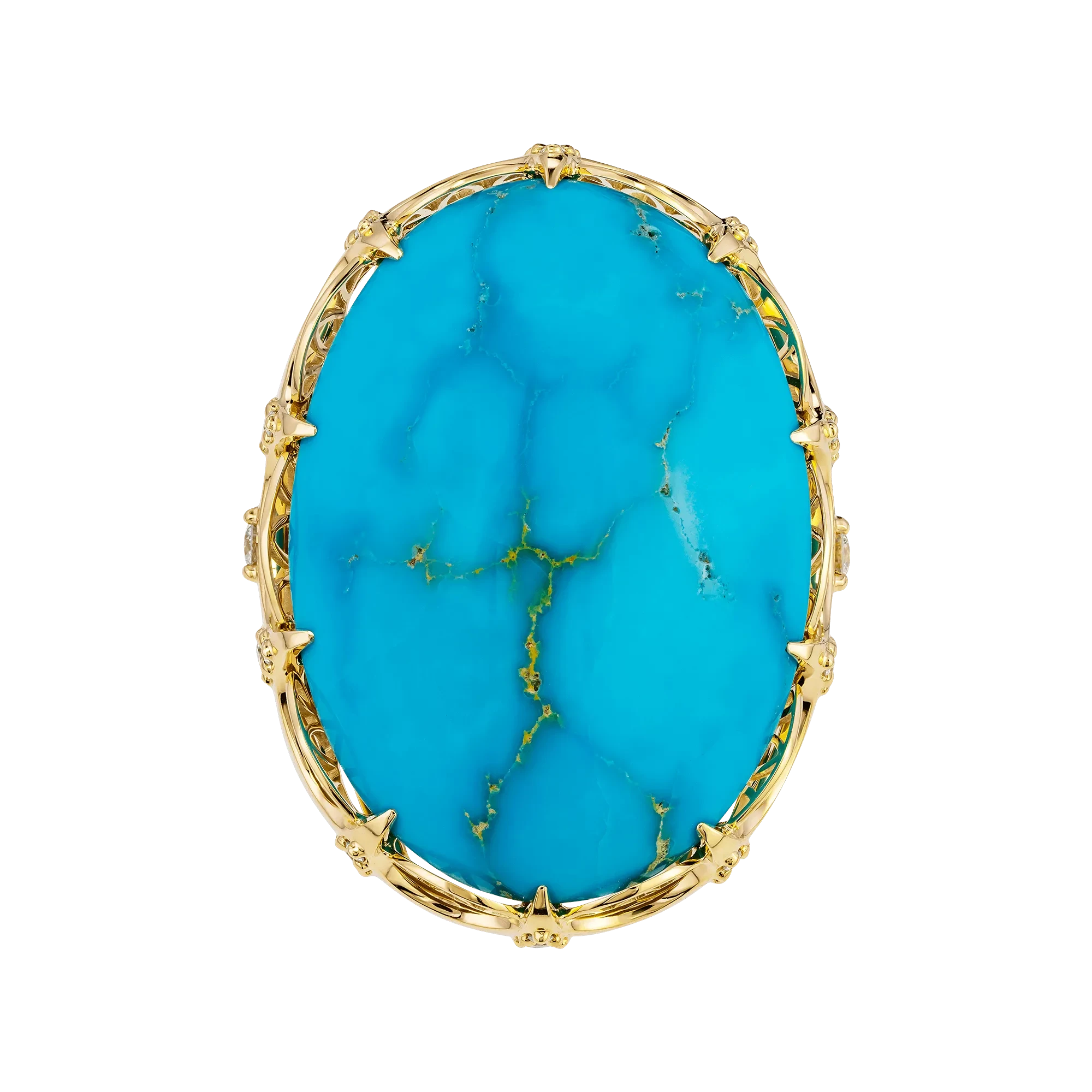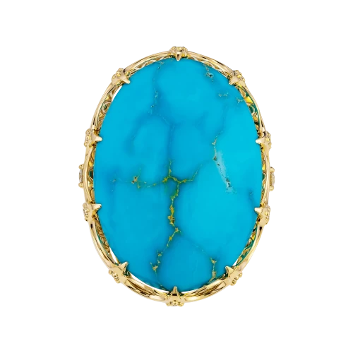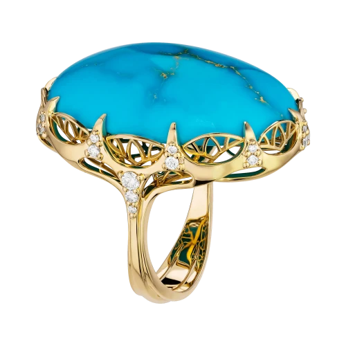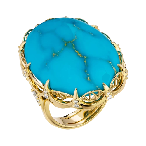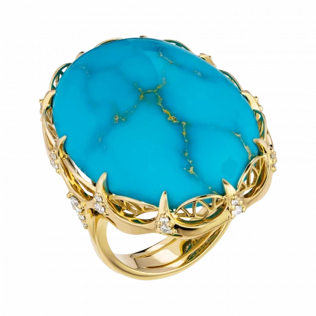 В центре композиции – аризонская бирюза весом 28,47 карат. Её интенсивный голубой оттенок с золотистыми прожилками напоминает о небесах над песчаной равниной и о тропах, прочерченных солнцем. Драгоценный камень огранён в виде гладкого кабошона, подчёркивающего природную текстуру и уникальность минерала.