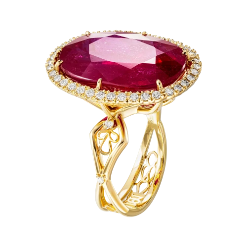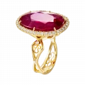 Притягательным центром фееричного эксклюзива, элегантно вплетенным в ажур оправы из желтого золота, стал крупный рубин, чья виртуозная огранка подчеркивает все его природные достоинства: сияющую чистоту, насыщенную глубину и пламенную суть.
