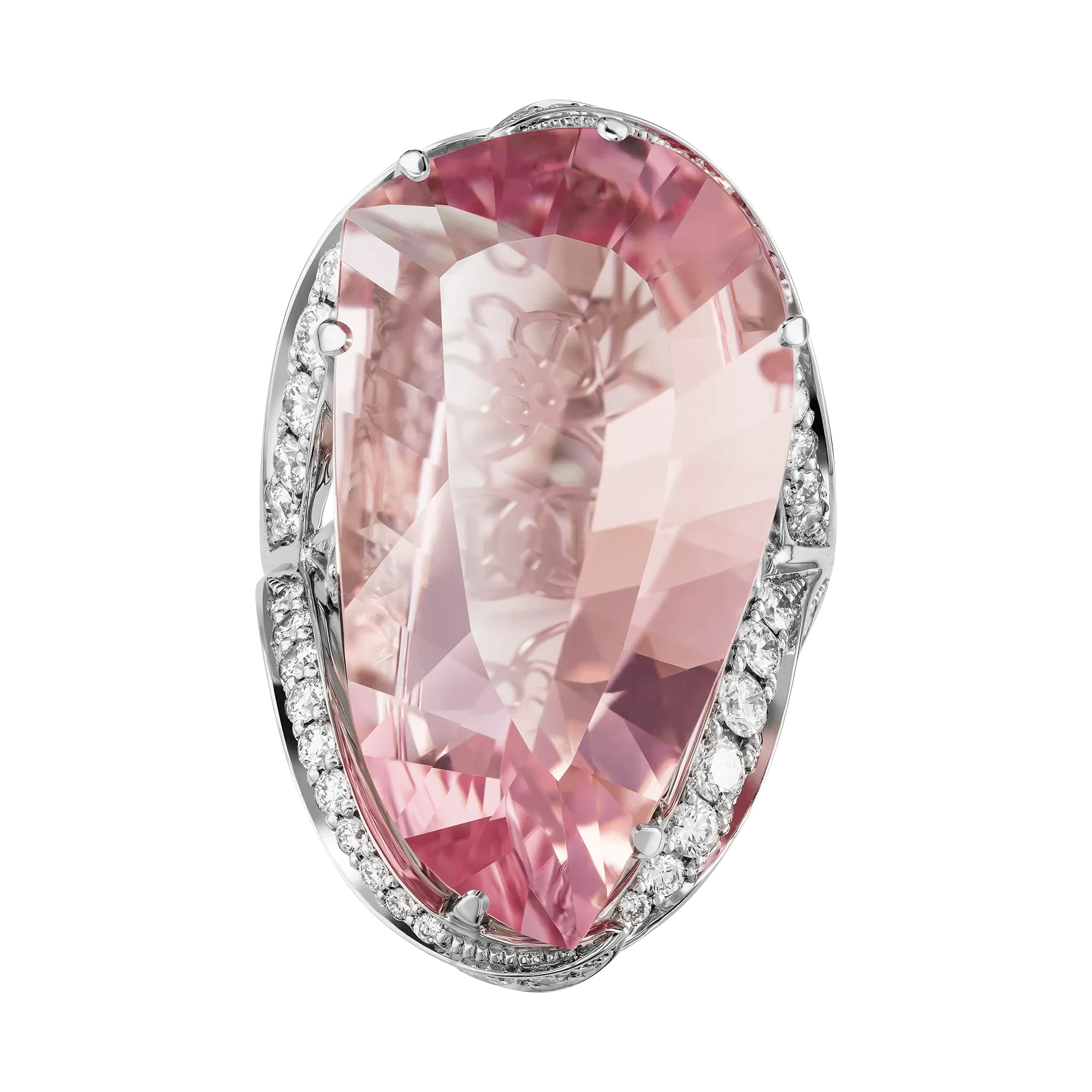 Воздушное украшение словно открывает двери в мир грёз, где границы между реальностью и фантазией стираются. Центральный морганит из Бразилии весом 19,55 карат сияет в фантазийной огранке, навевая образ розового миража на горизонте – притягательного и неуловимого, оставляющего лишь лёгкое ощущение тайны и предвкушения. Его утончённый оттенок напоминает свет первых рассветных лучей, наполняя настроение воздушной романтикой.