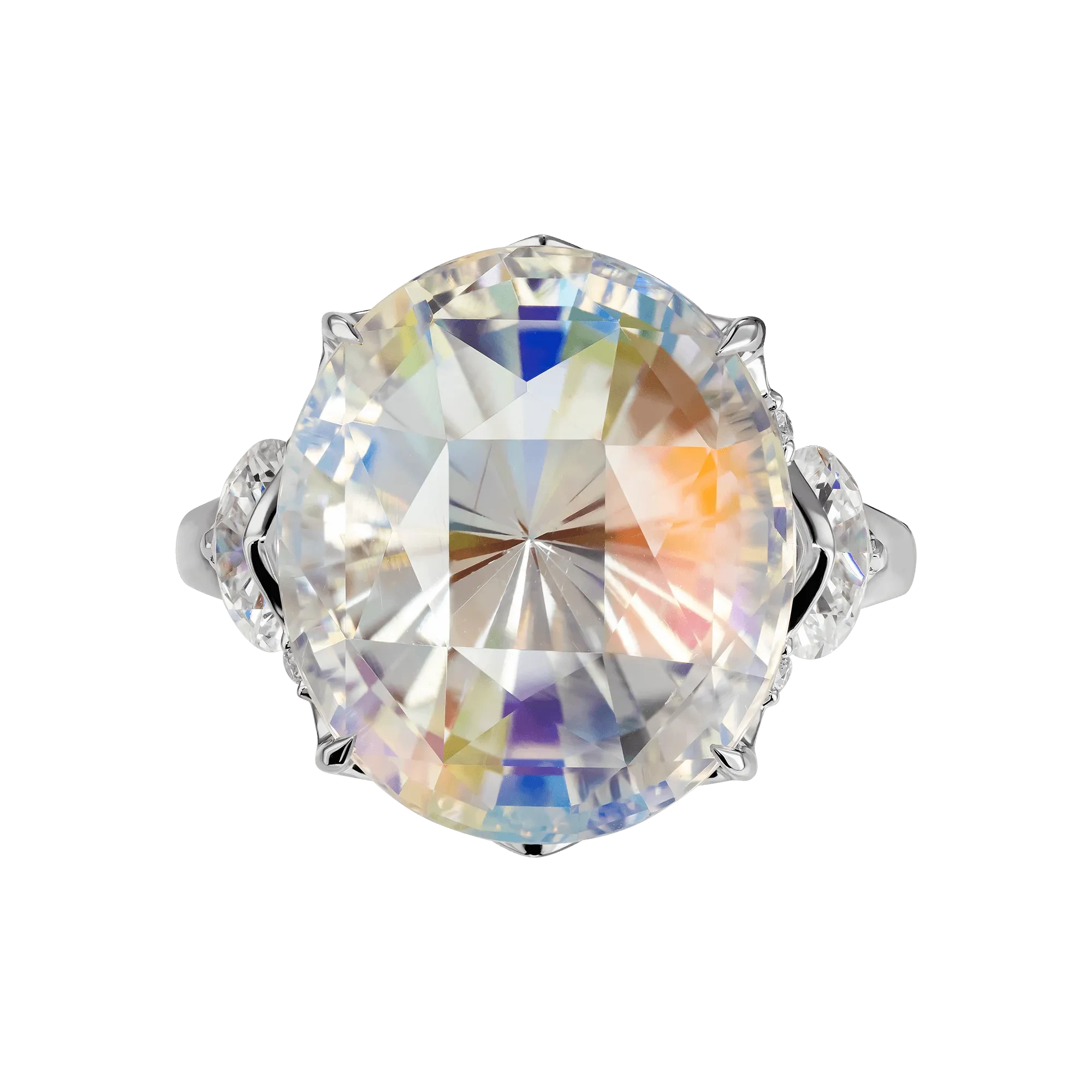 Увеличивают эффект полнолуния, придавая довольно большой энергетический заряд для созидательной деятельности, крупные бриллианты общим весом более одного карата, которые, словно звезды на ночном небосклоне, подчеркивают всю выразительность главного камня. Каждый из этих бриллиантов великолепно сверкает, создавая эффект искрящегося света, символизируя многослойность и многогранность женской души.