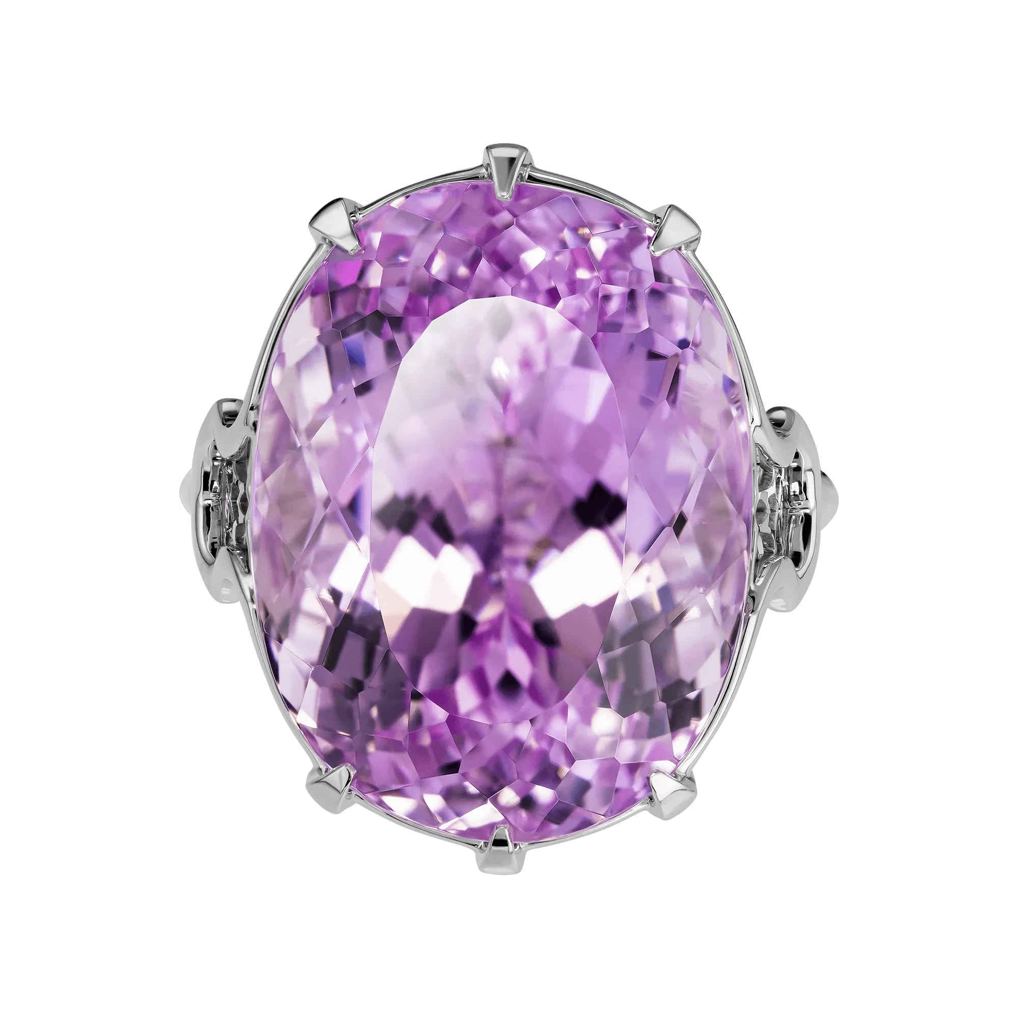 Оправа из белого золота выстроена предельно лаконично и работает как точная архитектурная поддержка. Она не замыкает самоцвет, а оставляет его открытым свету со всех сторон, позволяя кунциту проявить свои оптические свойства в полной мере. Такое решение требует безупречного расчёта пропорций и подчёркивает высокий уровень ювелирного исполнения.