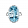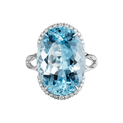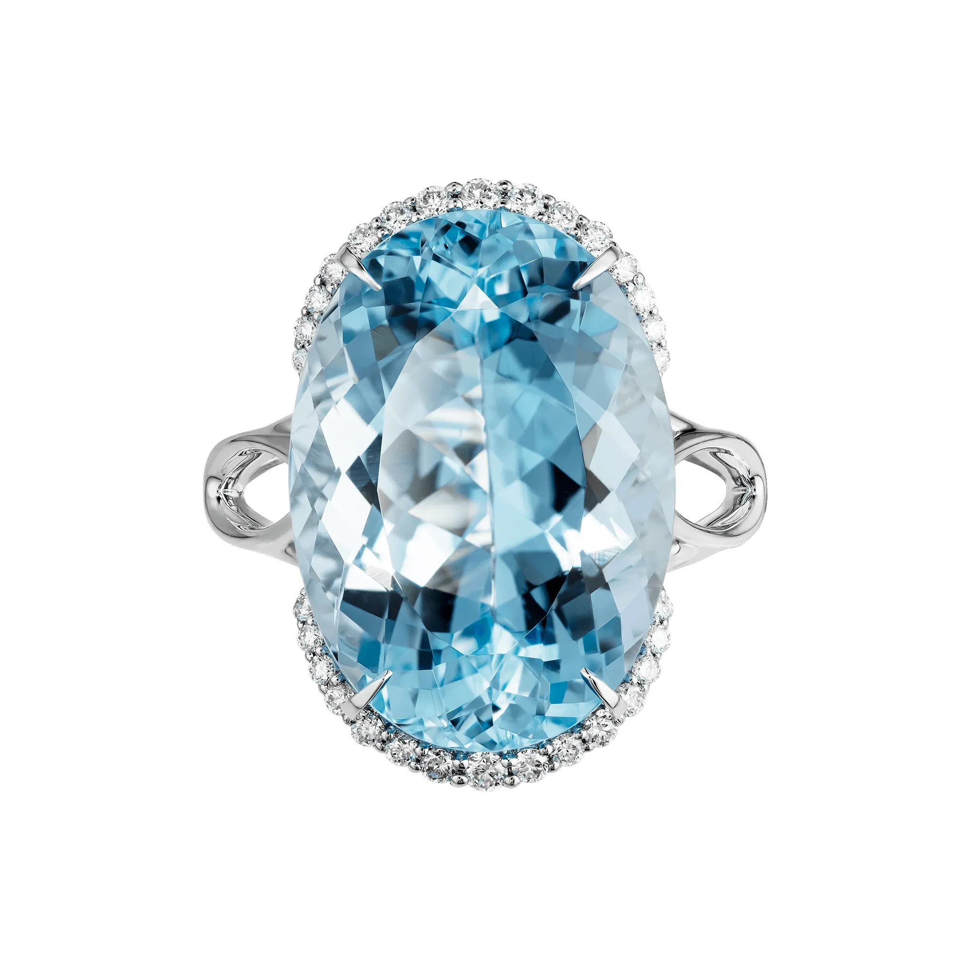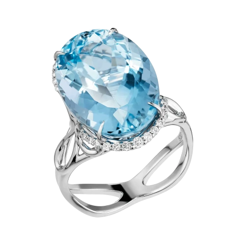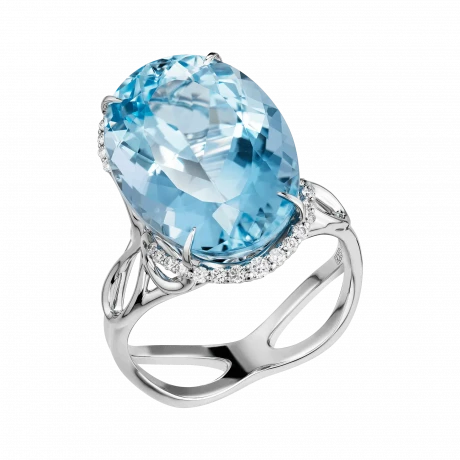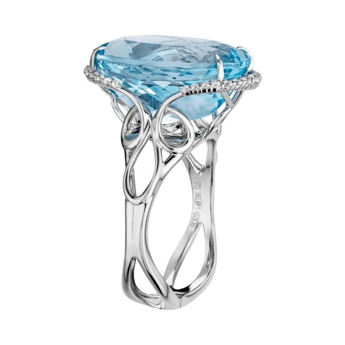 В центре композиции сияет бразильский аквамарин овальной огранки весом 12,39 карат. Его лазурный тон вобрал в себя прозрачность рассветного неба, где встречаются прохлада и ясность. Каждая грань минерала отражает не только солнечные лучи, но и само движение воздуха, преобразуя его в светлое внутреннее свечение.