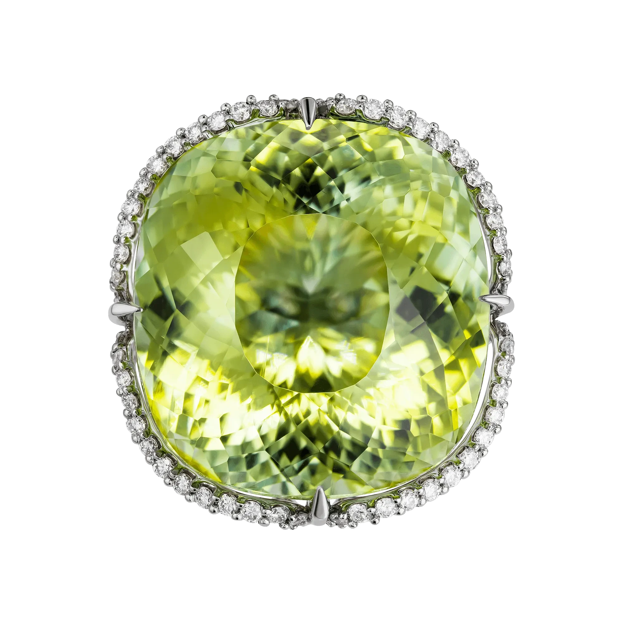 В сердце композиции – турмалин редкого канареечного оттенка весом 36,19 карата. Его сияние –внутренний импульс, напоминание о том, что в каждой драгоценности заключено движение жизни. В глубине камня мерцает зелёный свет, как утренняя заря, пробивающаяся сквозь тончайшую пелену тумана.