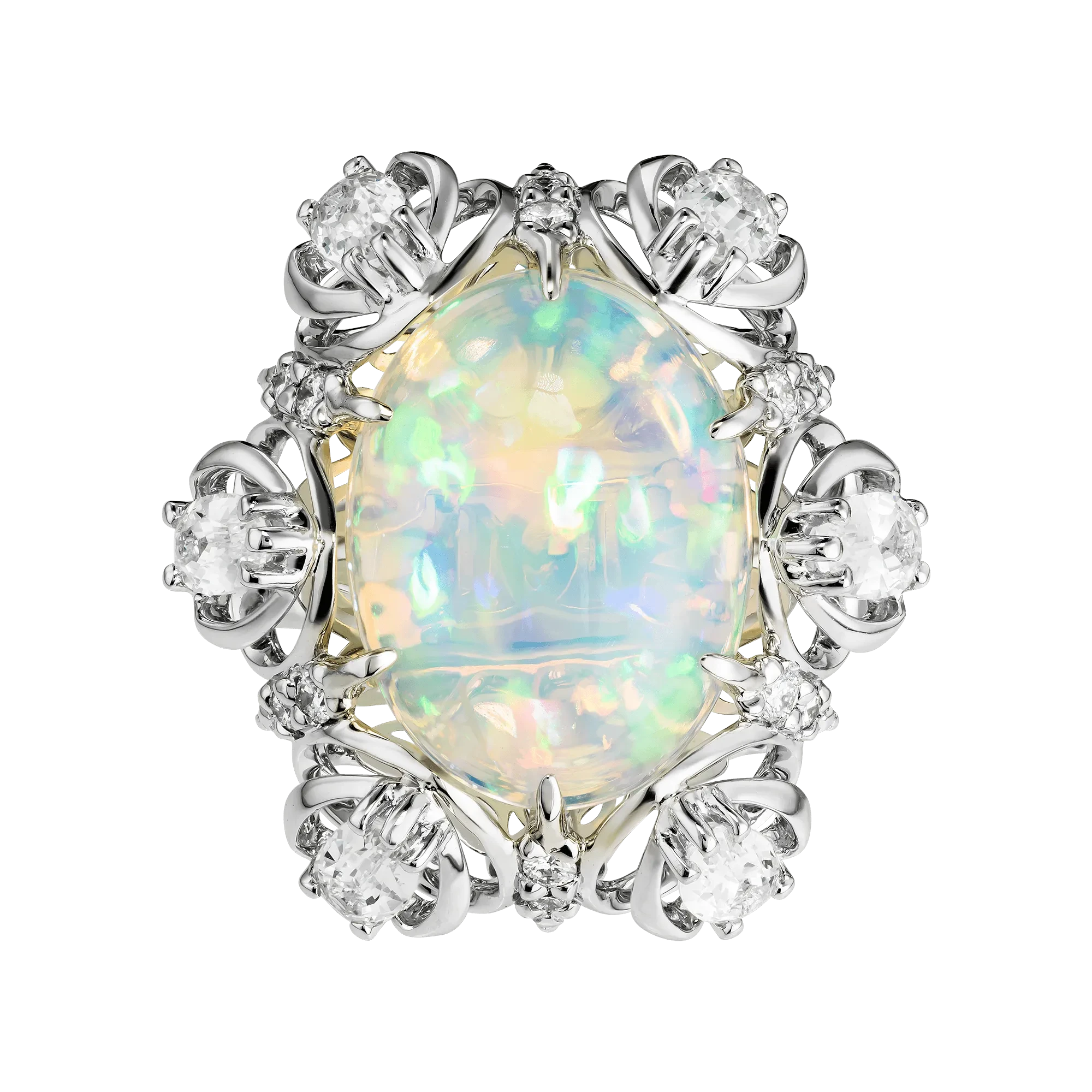 Оправа из белого золота выстроена как динамичная композиция, поддерживающая центральный камень. Лаконичные, но пластичные линии металла направлены вверх, усиливая ощущение устремлённости. Световые акценты из бриллиантов и белых сапфиров обрамляют опал, подчёркивая его природную яркость и создавая контраст холодного сияния и тёплой глубины переливов.