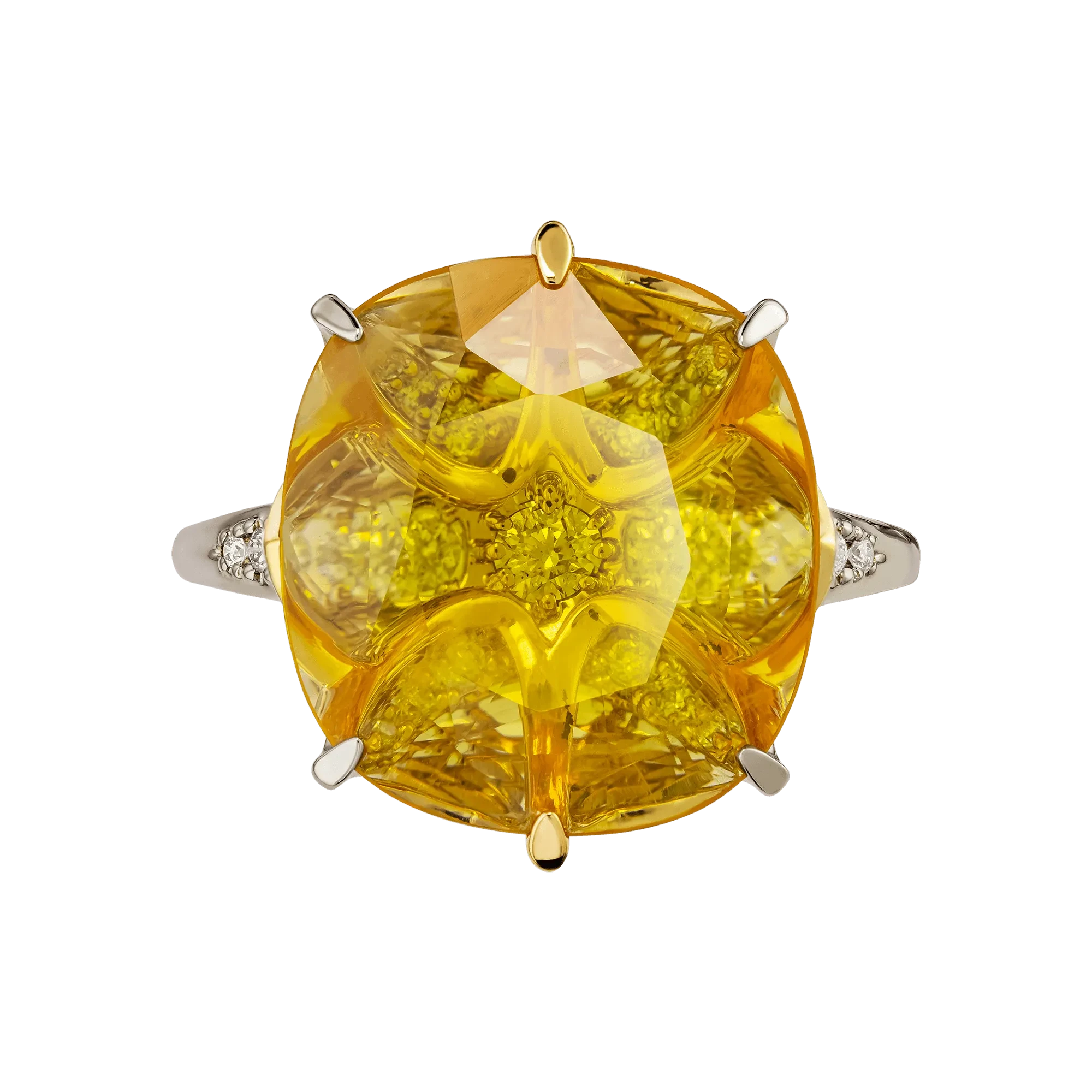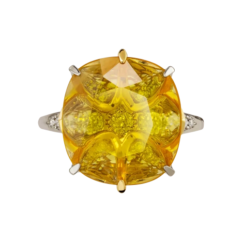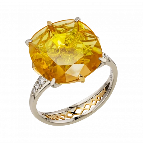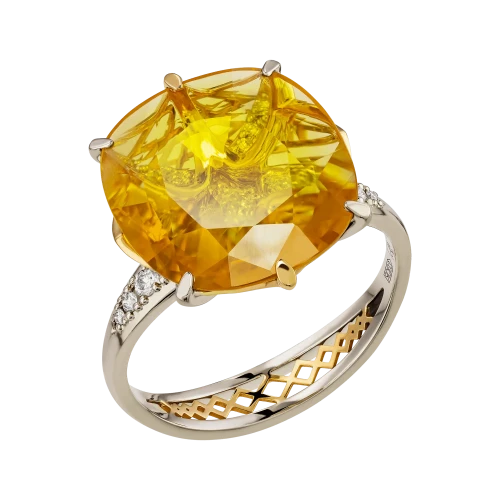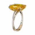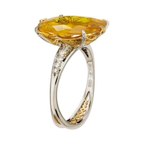 Жёлтый сапфир весом 6,22 карат, добытый на Шри-Ланке, завораживает своим живым светом: в его глубине – переливы золота, меда, дневного солнца. Благодаря огранке он дышит изнутри, будто вбирая в себя небесное сияние. Драгоценный камень органично вписан в желтое золото, где каждая линия оправы подчёркивает чистоту формы, а изысканный ажур на шине добавляет лёгкости и символичности композиции.