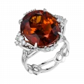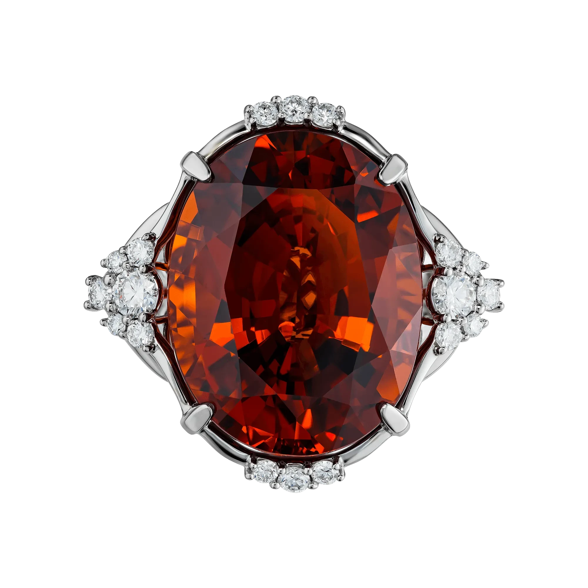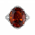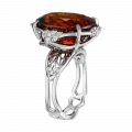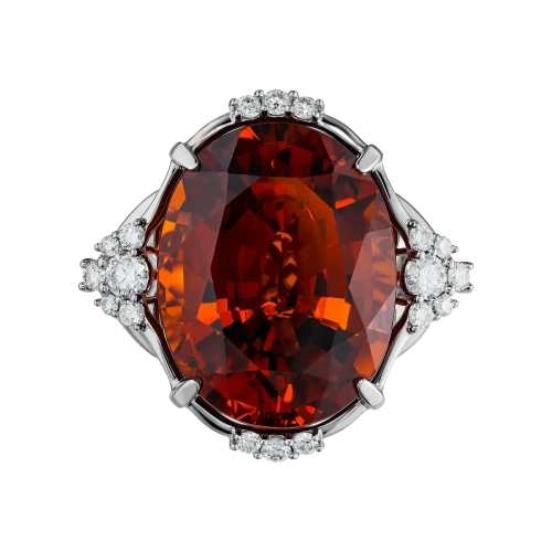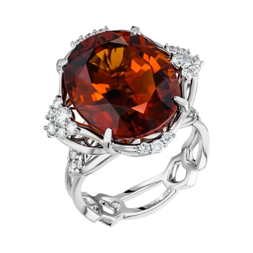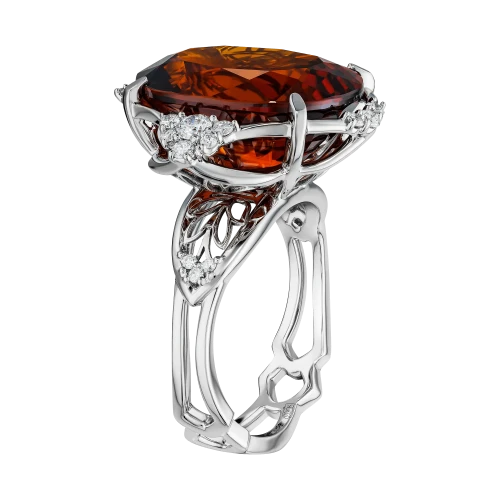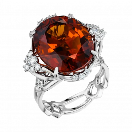 Оправа из белого золота выстроена в динамичной, пластичной архитектуре. Витиеватые линии, инкрустированные бриллиантами, усиливают ощущение импульса и направленного движения, формируя визуальный контраст с насыщенной теплотой центрального самоцвета. Холодный блеск металла подчёркивает глубину цвета спессартина, создавая гармоничный баланс между энергией и структурой.