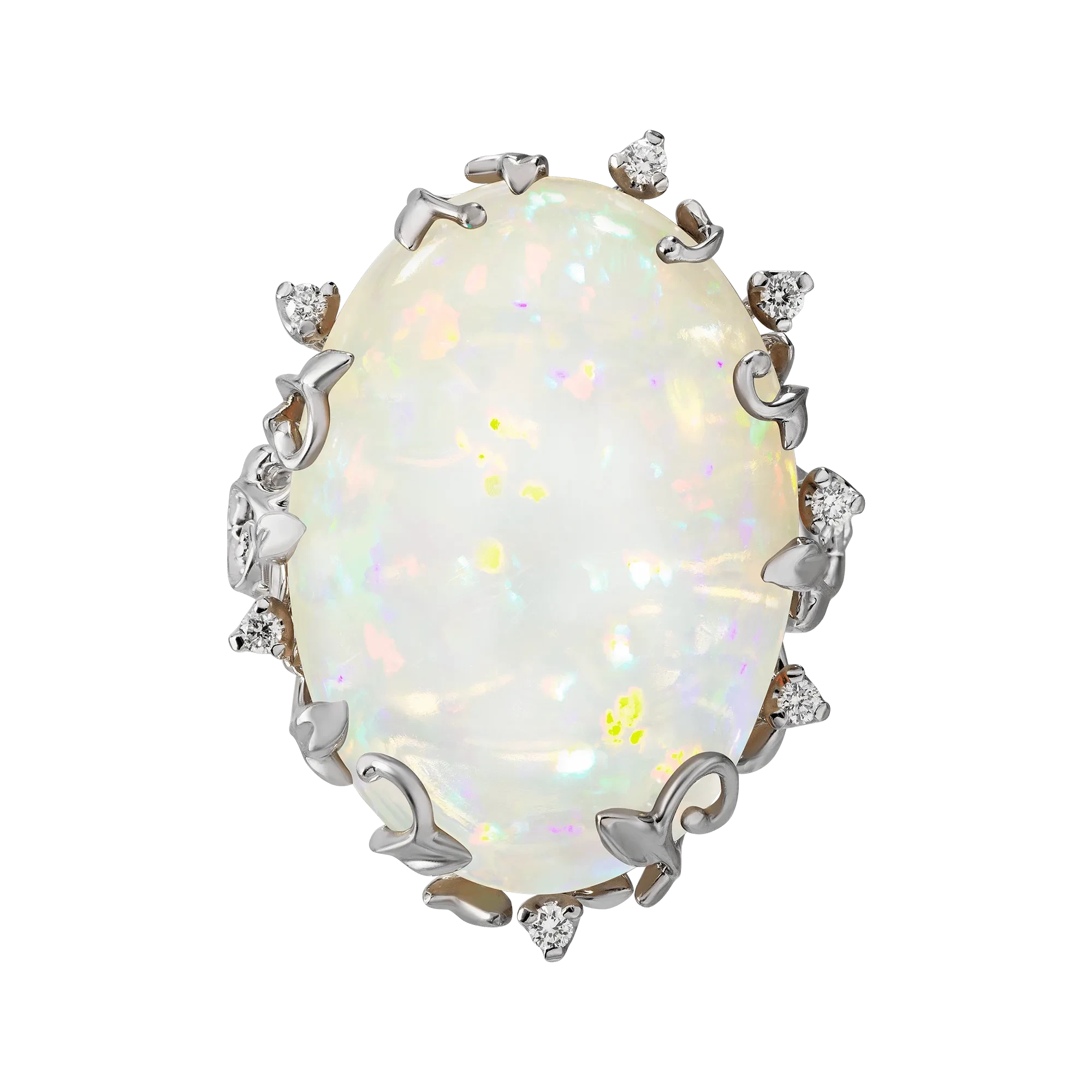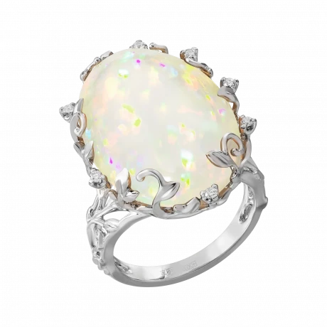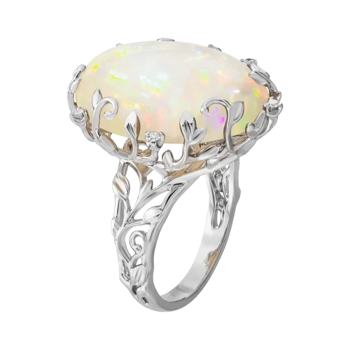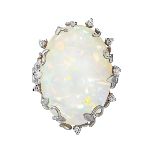 В сердце этого замысловатого переплетения сложносочиненной глянцевой основы, окруженный сверкающей бриллиантовой россыпью, центральное место занял крупный опал, добытый в глубинах Эфиопии. Из всего многообразия минералов, известных не одно тысячелетие, именно молочные самоцветы считаются сильнейшими талисманами, обладая силой и красотой, способной положительно влиять на жизнь владелицы.