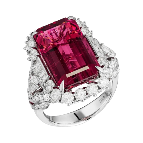 Окружение из бриллиантов и изящные линии оправы из белого золота выполняют роль архитектурного обрамления — они подчёркивают масштаб центрального камня, не отвлекая от него внимания. В результате кольцо воспринимается как торжественный акцент, где пышность выражена не в избыточности деталей, а в силе и красоте самого рубеллита.