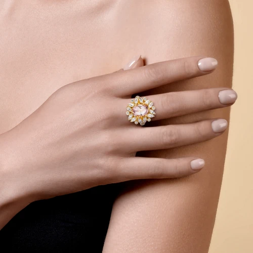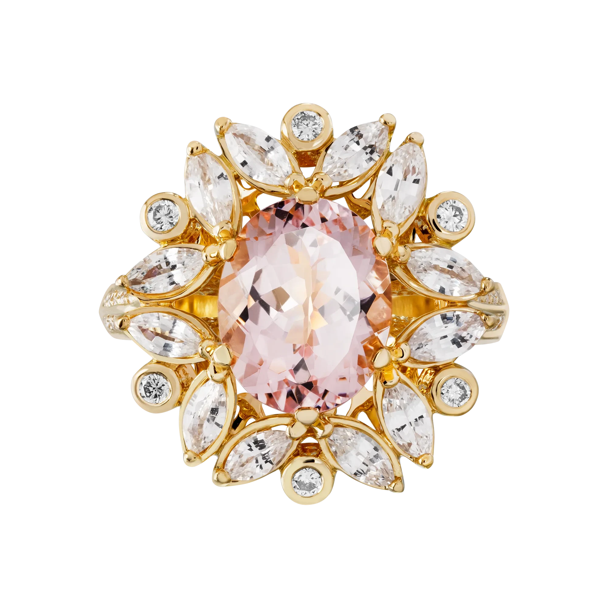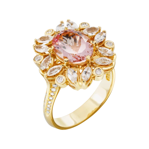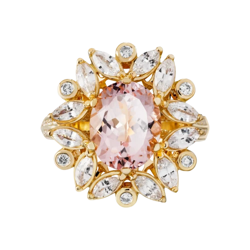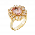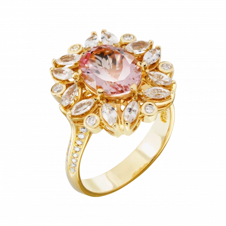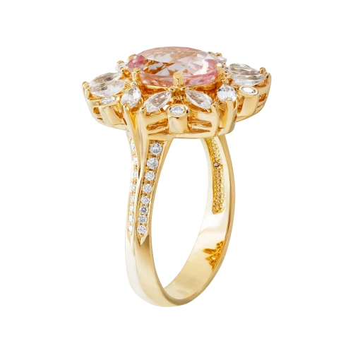 Очаровательное кольцо из желтого золота в форме цветка, ставшее плодом идеального сочетания фантазии и умелых рук, не было бы столь неподражаемым, если бы геммологи не нашли для него выдающийся морганит, занявший центральное место в сердце авторского украшения.