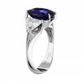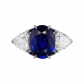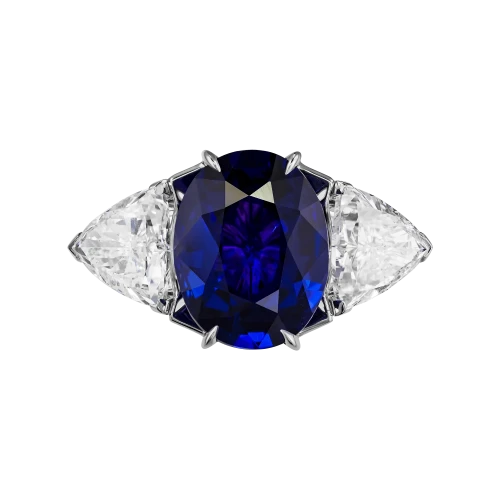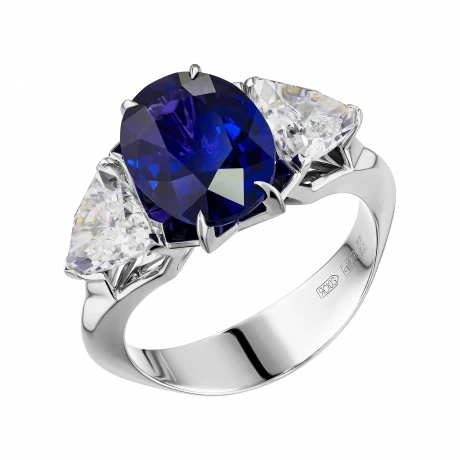 По бокам центрального камня расположены два крупных бриллианта необычной огранки – они создают архитектурную выразительность, подчёркивают чистоту цвета сапфира и усиливают его визуальную значимость. Лаконичная оправа из белого золота формирует классическую инвестиционную композицию: никаких лишних деталей, только точные линии, чистый свет и уверенность в ценности.