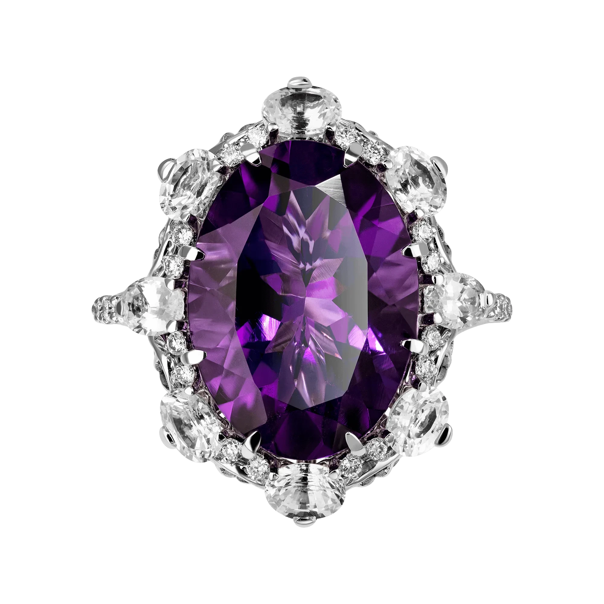 Аметист в элегантно зафиксированном белом золоте – благородное сочетание. Череда сверкающих бриллиантов и сапфиров, красивым кругом уложенных вокруг центрального минерала весом почти в семь карат, придает украшению великолепное сияние.
