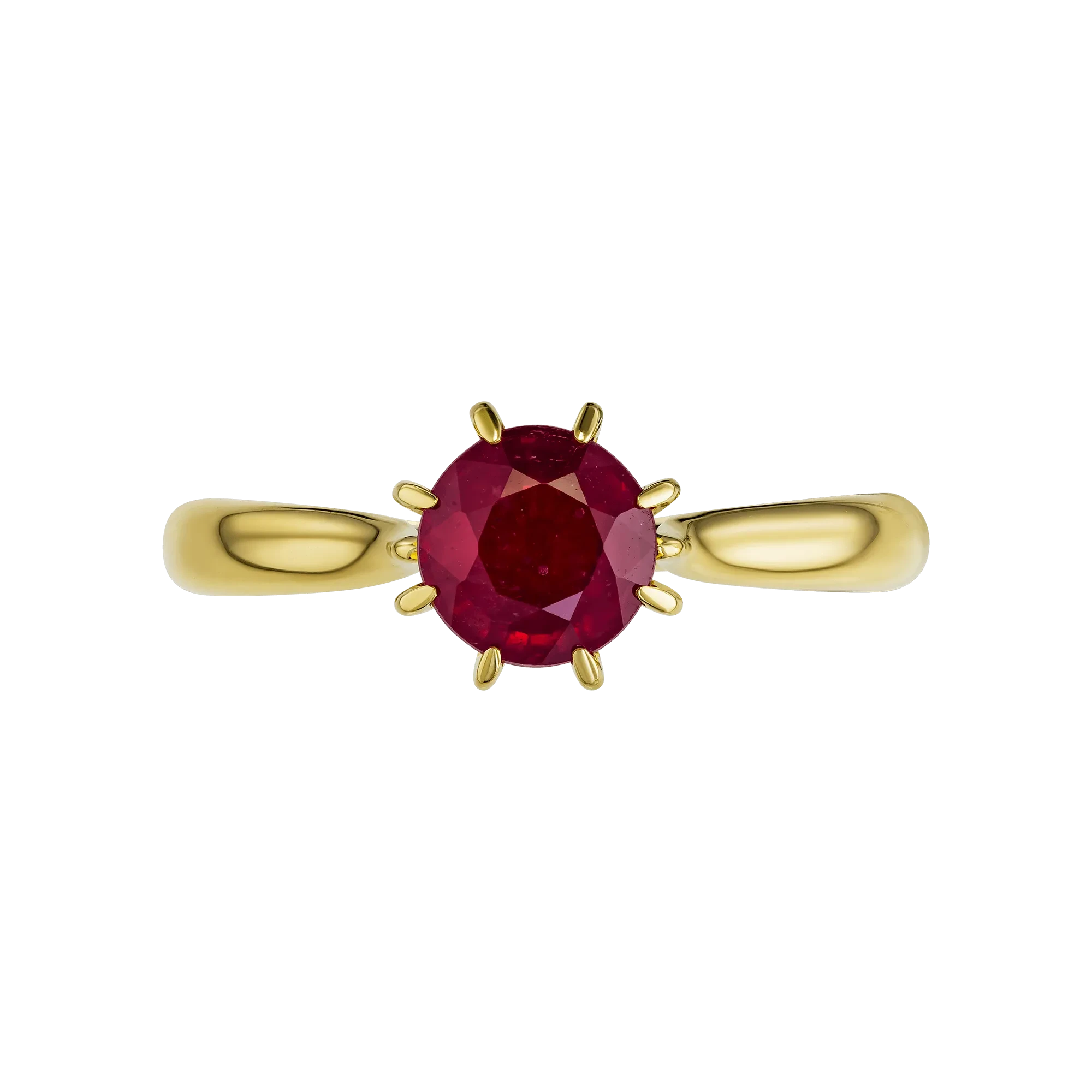 Оправа из жёлтого золота выбрана так, чтобы подчеркнуть природное тепло самоцвета: металл отражает оттенки камня, усиливает их и создаёт мягкое сияние вокруг центральной вставки. Лаконичная архитектура кольца делает рубин единственным смысловым центром — выразительным, ярким, но при этом удивительно элегантным.