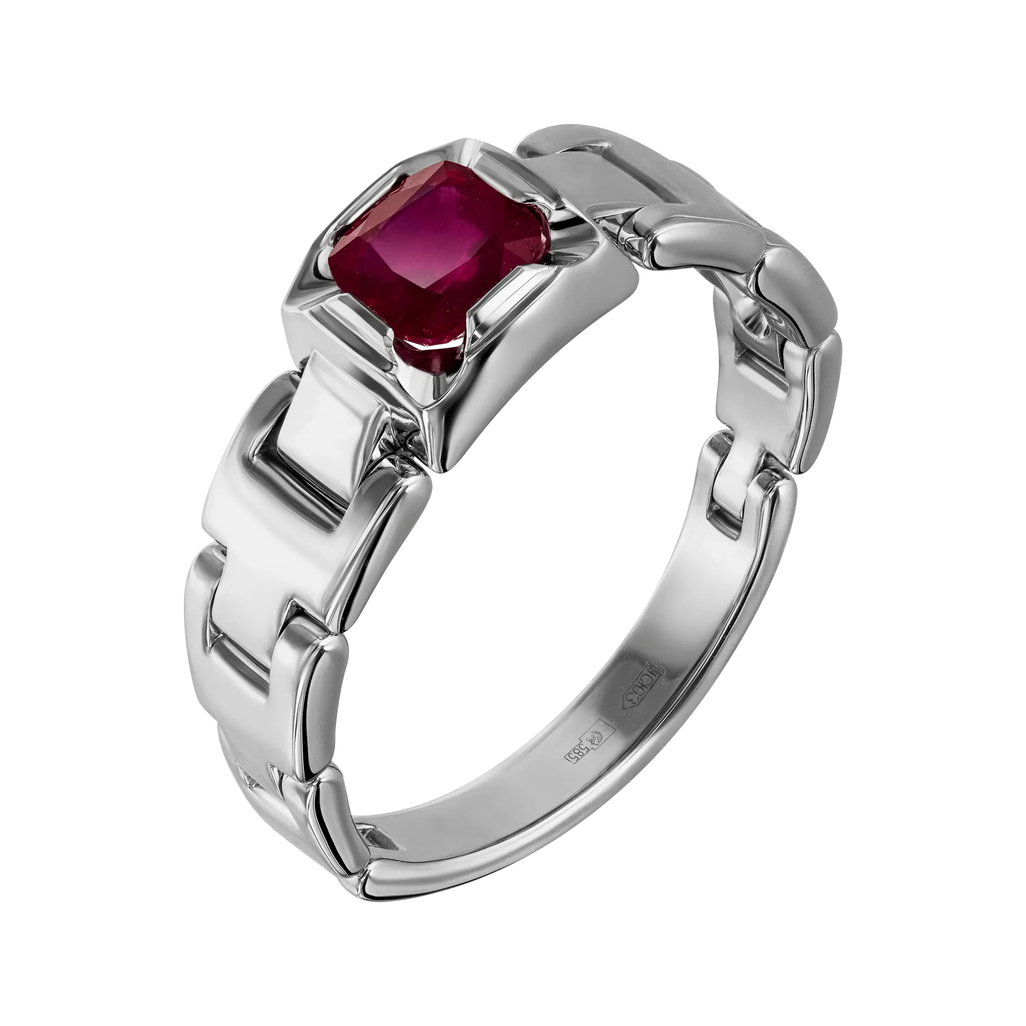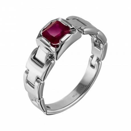 Все в этом брутальном украшении из белого золота излучает уверенность: лаконичный, но, вместе с тем интересный дизайн, заключающийся в гибкости оправы, удобно садящейся на палец и главный акцент – безупречный рубин, еще много тысячелетий назад включенный в элитный и, потому, короткий список драгоценных камней первого порядка.