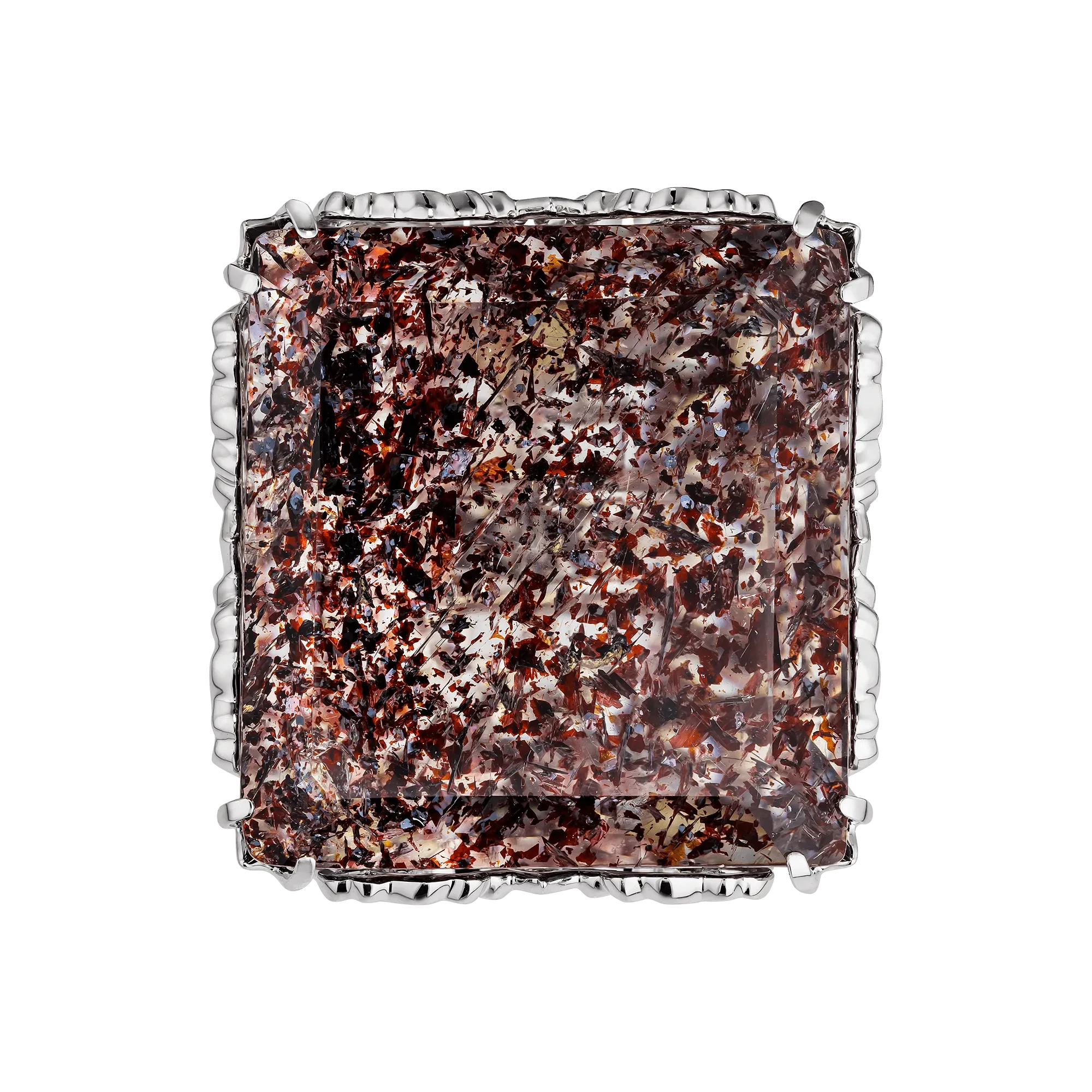 В центре композиции — клубничный кварц весом 56,07 карата, привезённый из Индии. Этот редкий минерал ценится за характерные включения гематита и лепидокрокита, которые формируют внутри кристалла розово-красный рисунок, напоминающий текстуру спелой ягоды. Каждый такой камень уникален: природные узоры не повторяются, превращая самоцвет в индивидуальный природный «пейзаж». Высокая прозрачность кварца позволяет свету свободно проходить сквозь толщу камня, усиливая глубину цвета и создавая эффект внутреннего тепла.