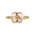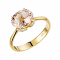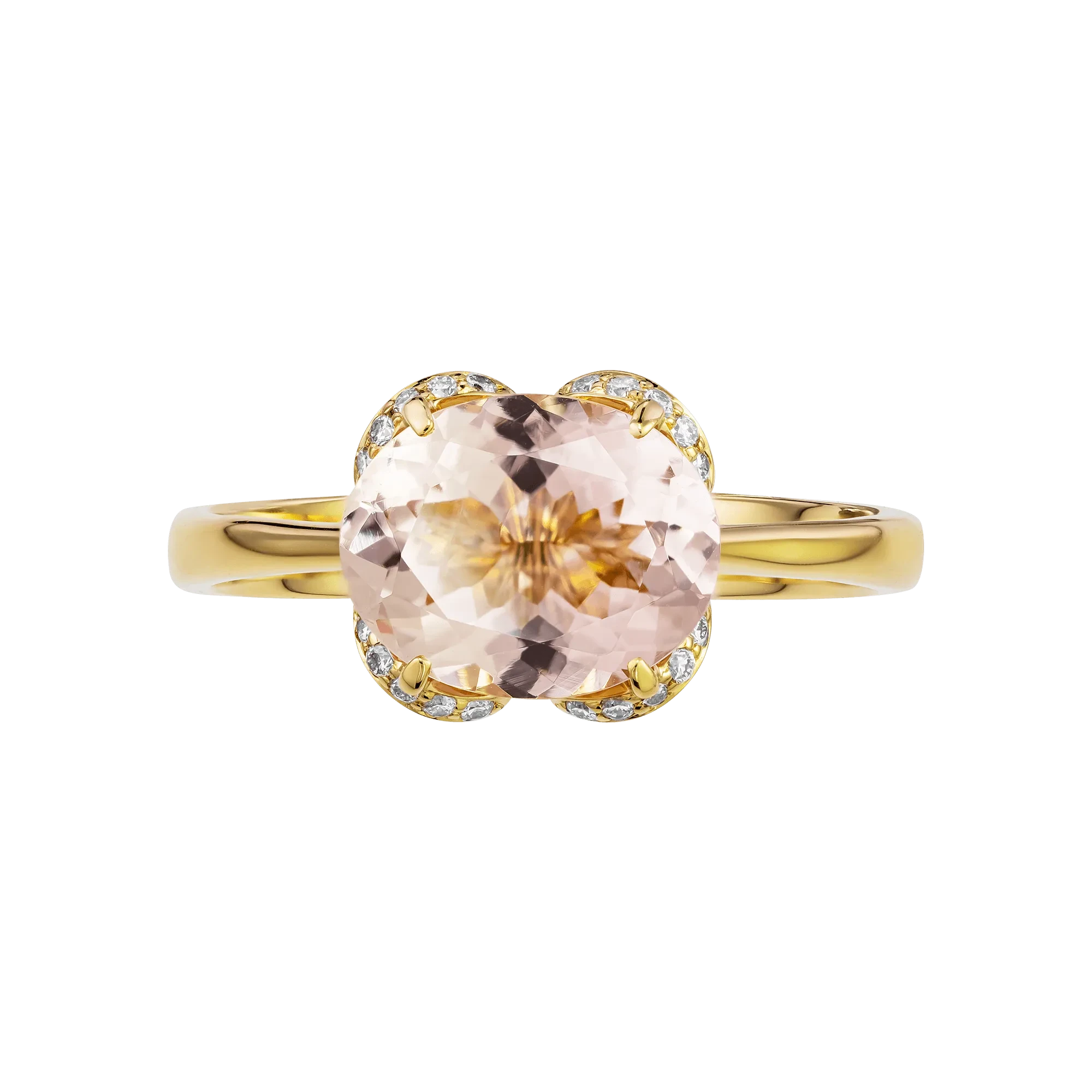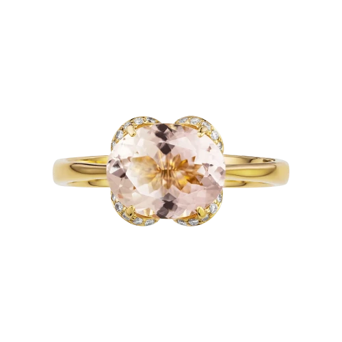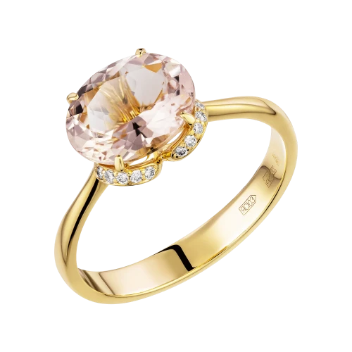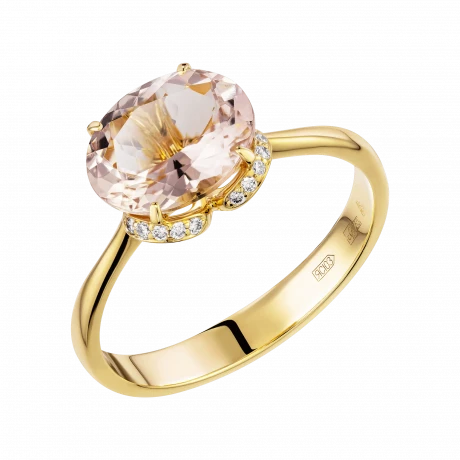 Центральный камень – морганит весом 2,16 карат переливается оттенками чайной розы, персика и пудрового золота. Его деликатный блеск дополнен сиянием бриллиантов, выстроенных в полудуги, которые придают композиции мягкое движение и подчёркивают световую игру. Оправа из жёлтого золота, как солнечное касание, наполняющее самоцвет теплом и благородством.