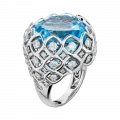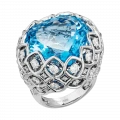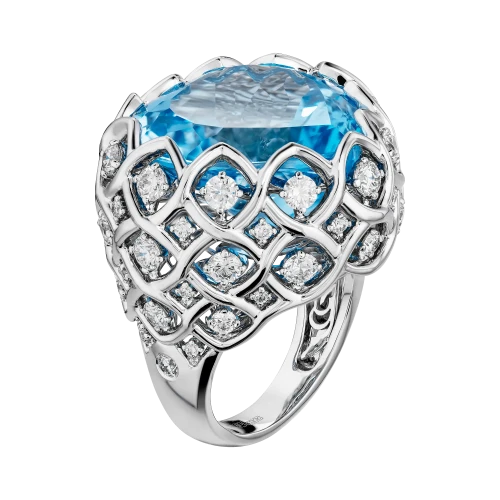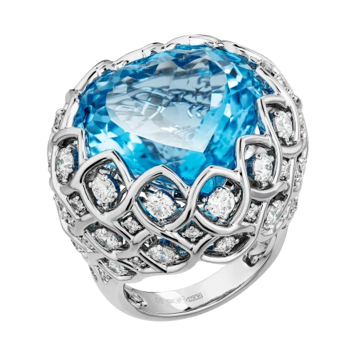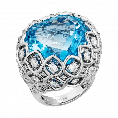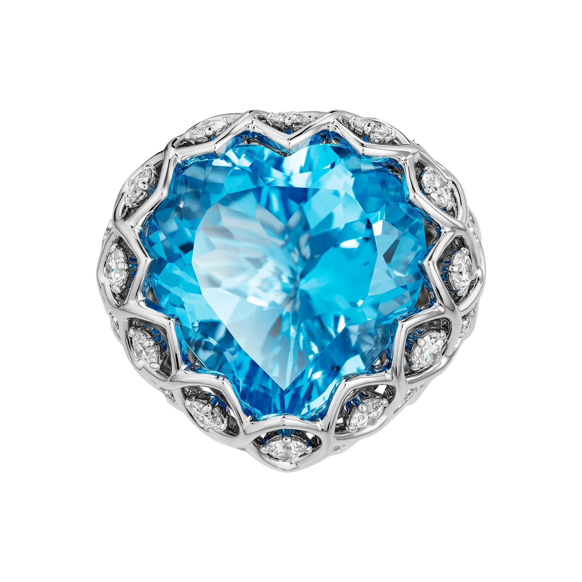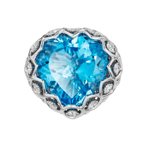 Центральный акцент – крупный бразильский топаз весом 30,69 карат, огранённый в форме сердца. Его ярко-голубой оттенок напоминает прозрачность небес после грозы, свежесть горного озера на рассвете, отражение самой сути свободы. Свет, проходя сквозь драгоценный камень, становится эмоцией — струящейся, живой, запоминающейся. Ажурная оправа из белого золота, усыпанная сверкающими бриллиантами, будто вторит ритму влюблённого сердца – с пульсом, с дрожью, с переливами света.
