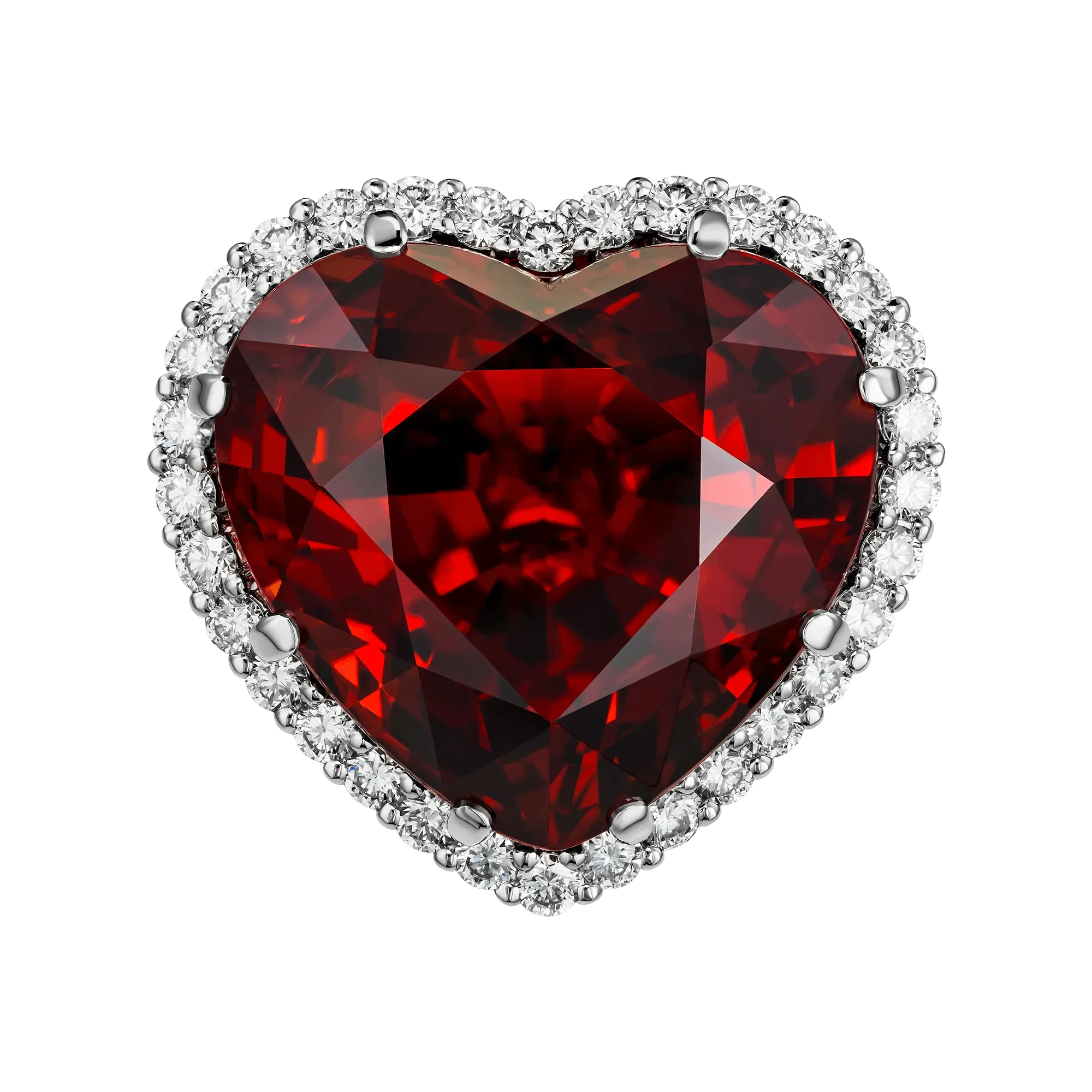 В центре композиции – впечатляющий спессартин весом 30,57 карата, огранённый в форму сердца. Камень обладает уникальной оптической динамикой: он словно загорается изнутри при каждом движении, раскрывая новые слои цвета. Такой эффект называют «мандариновым огнём» – редким признаком минералов исключительной категории.