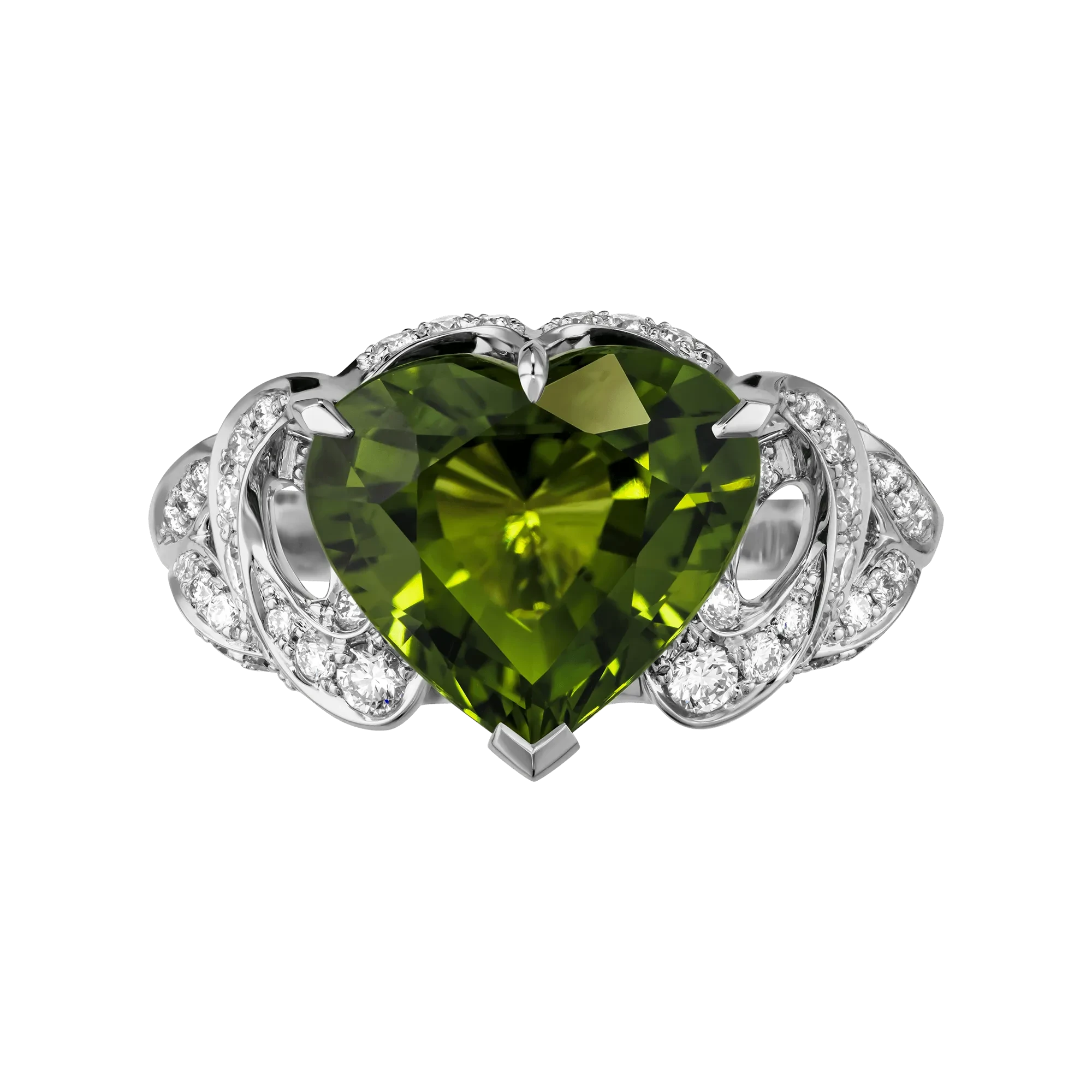 Центральным акцентом был выбран зелёный сапфир весом 6,33 карата из Мадагаскара, огранённый в форме сердца. Драгоценные камни этого происхождения ценятся за характерный спектр зелёных оттенков и чистоту кристаллов, делающие каждый сапфир уникальным коллекционным экземпляром.