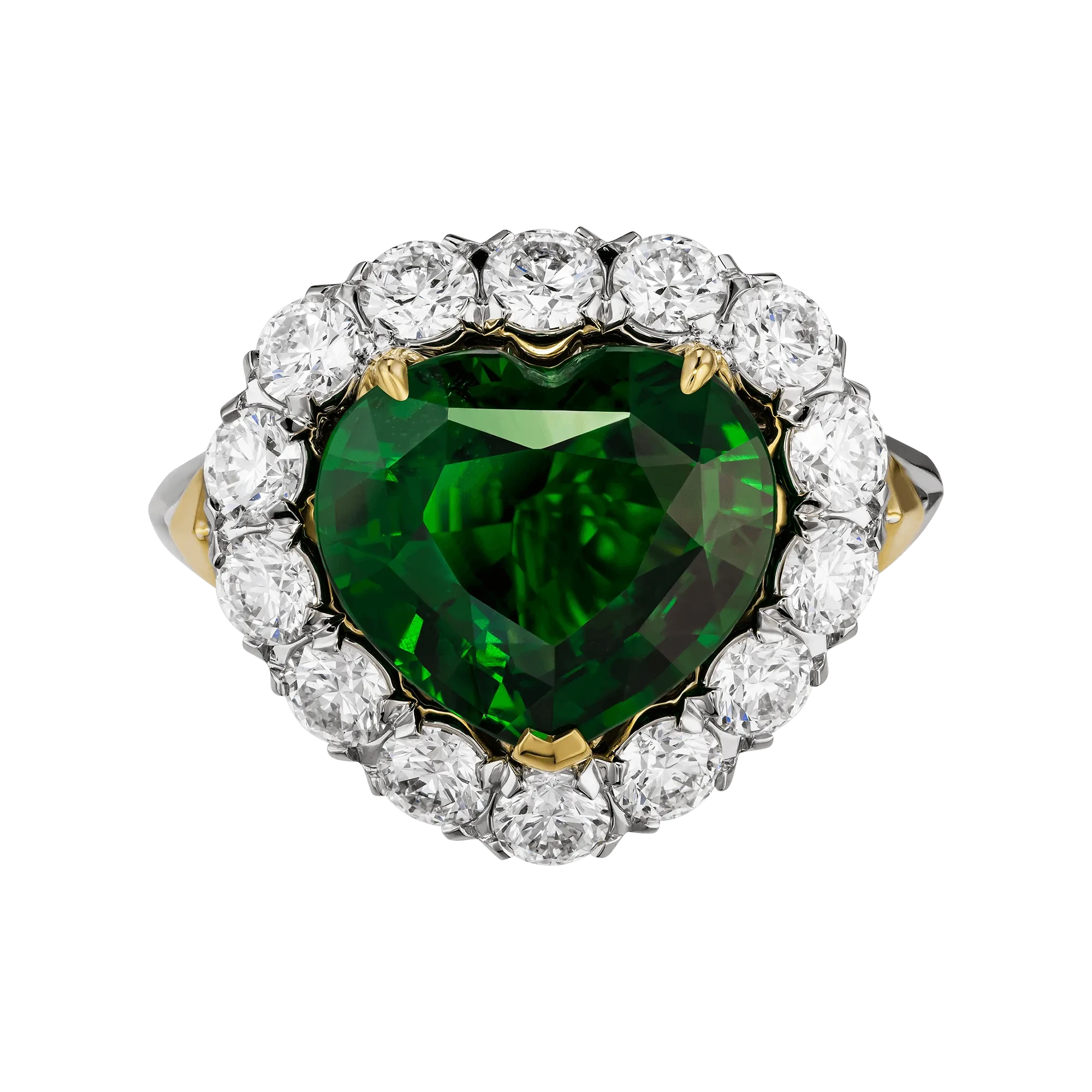 В украшении «Сердечный трепет» драгоценный камень становится отражением хрупкого и глубокого состояния души. Редкий тсаворит весом 4,56 карат из Танзании огранён в форму сердца – символ искренности и внутренней силы чувств. Его насыщенный зелёный оттенок словно хранит дыхание природы, энергию обновления и гармонию, доступную лишь в самые сокровенные мгновения.