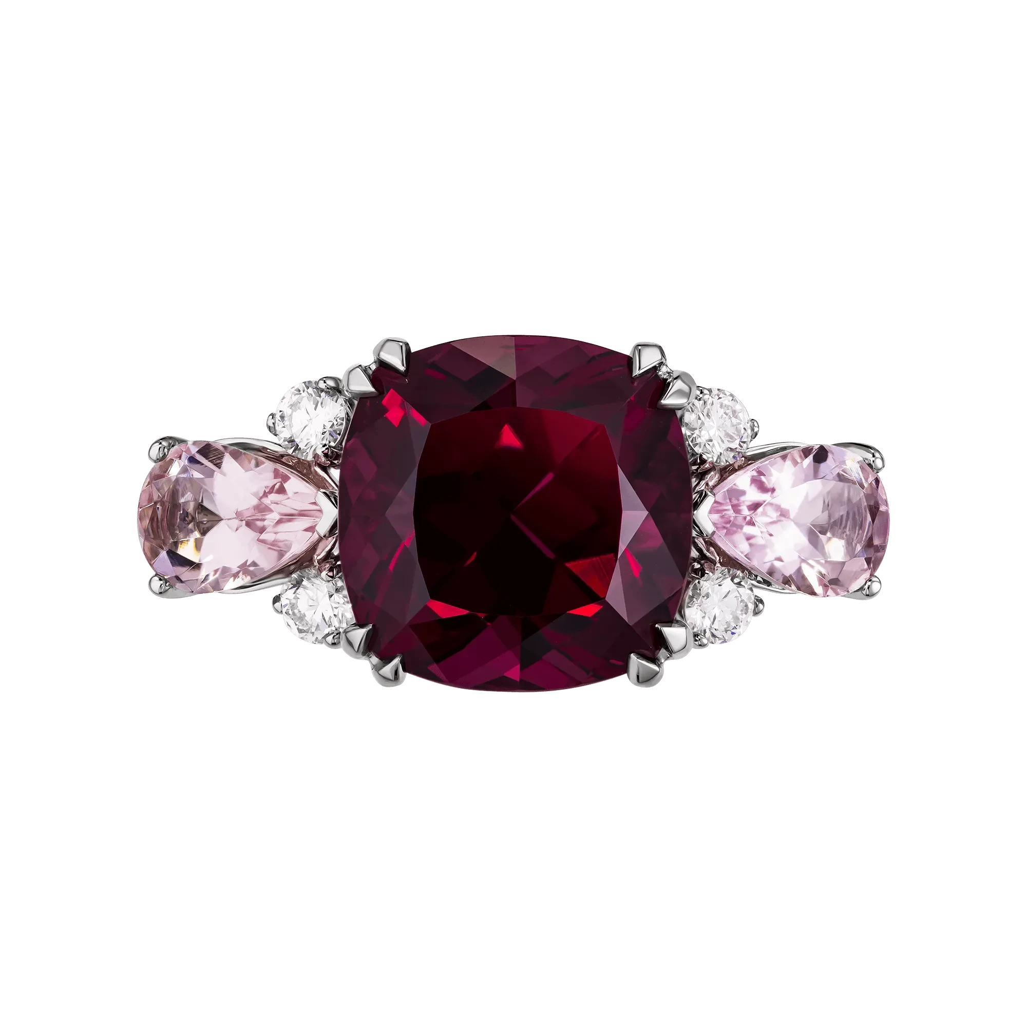 Родолит из Танзании весом 5,14 карата окружён тонким венцом из розовых морганитов и бриллиантов, чьё мерцание напоминает лёгкую росу на лепестках. Холодный блеск платины служит изящным фоном, позволяя природному камню зазвучать особенно многогранно – словно отблеск летнего вечера, когда всё вокруг дышит гармонией.