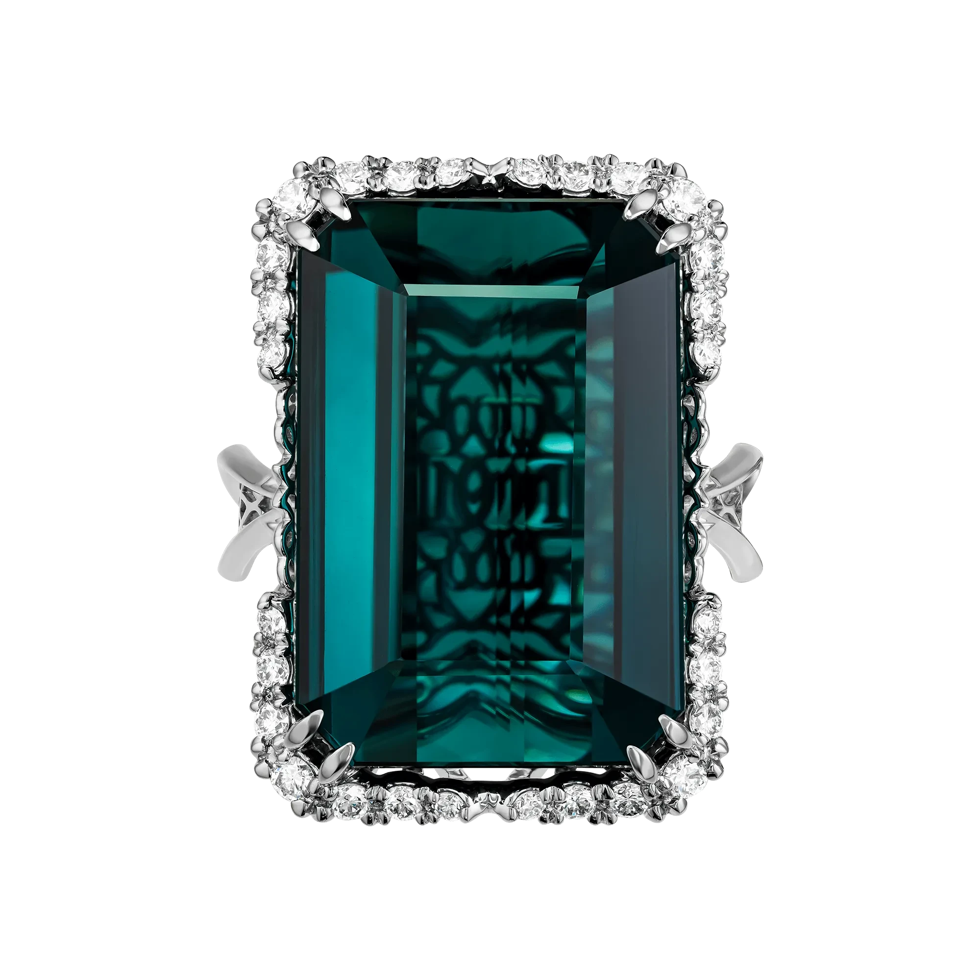 Центральный камень заключён в тончайшую ажурную конструкцию из белого золота: линии и узоры металла складываются в гибкий ритм, напоминающий струи ветра, скользящие вдоль формы. Его глубокий сине-зелёный цвет, обусловленный присутствием ионов железа в структуре кристалла, раскрывается многослойно – от холодной морской глубины до почти светящейся внутренней вибрации. Такое сочетание делает кольцо не просто украшением, а поэтическим образом стихии, в котором камень и форма звучат как единое дыхание.