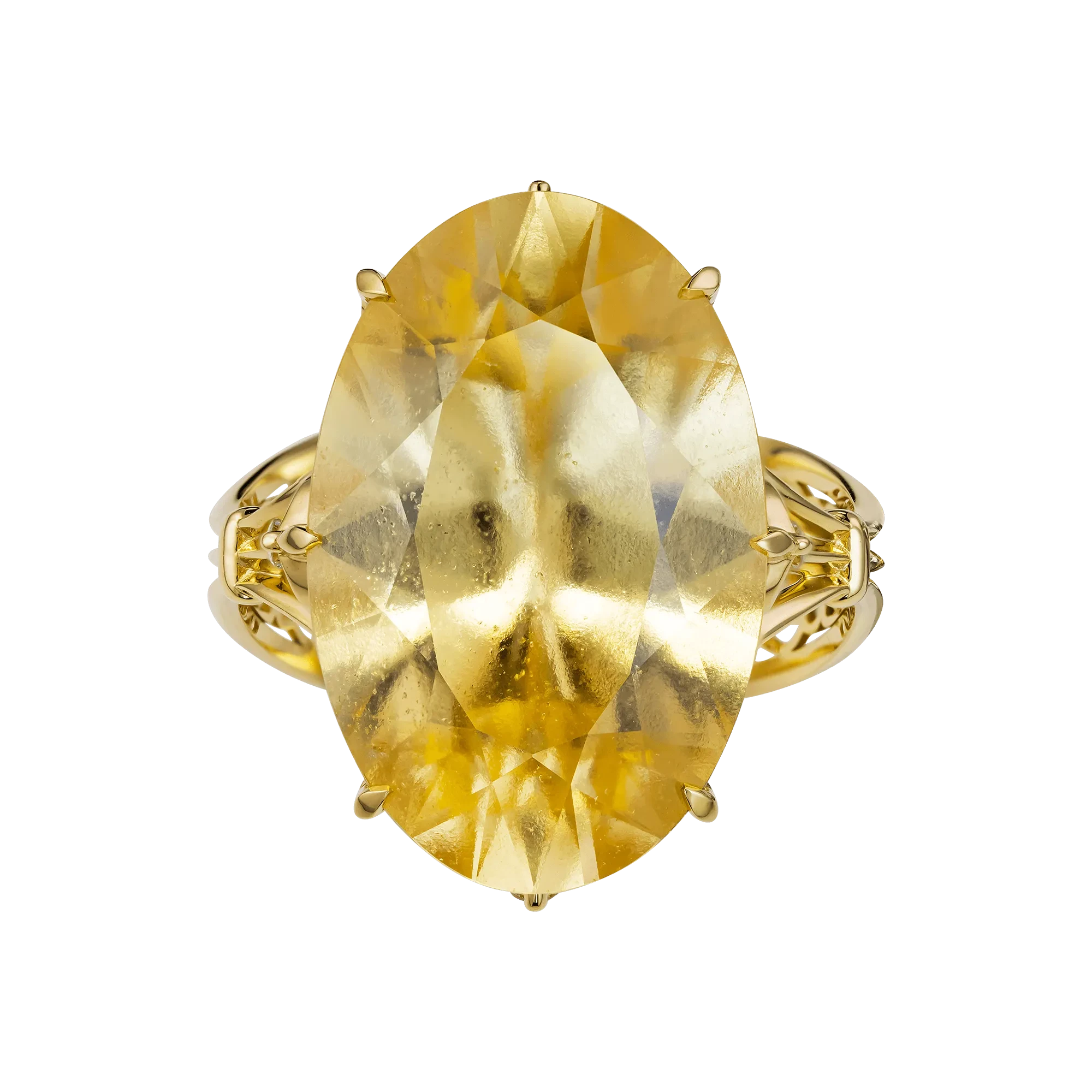 Оправа из жёлтого золота мягко обрамляет самоцвет, усиливая его природное сияние. Бриллианты, расположенные на поверхности кольца, играют роль маленьких искр, которые подчёркивают красоту драгоценного камня и создают впечатление, будто он хранит в себе целый поток солнечной энергии.