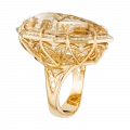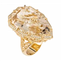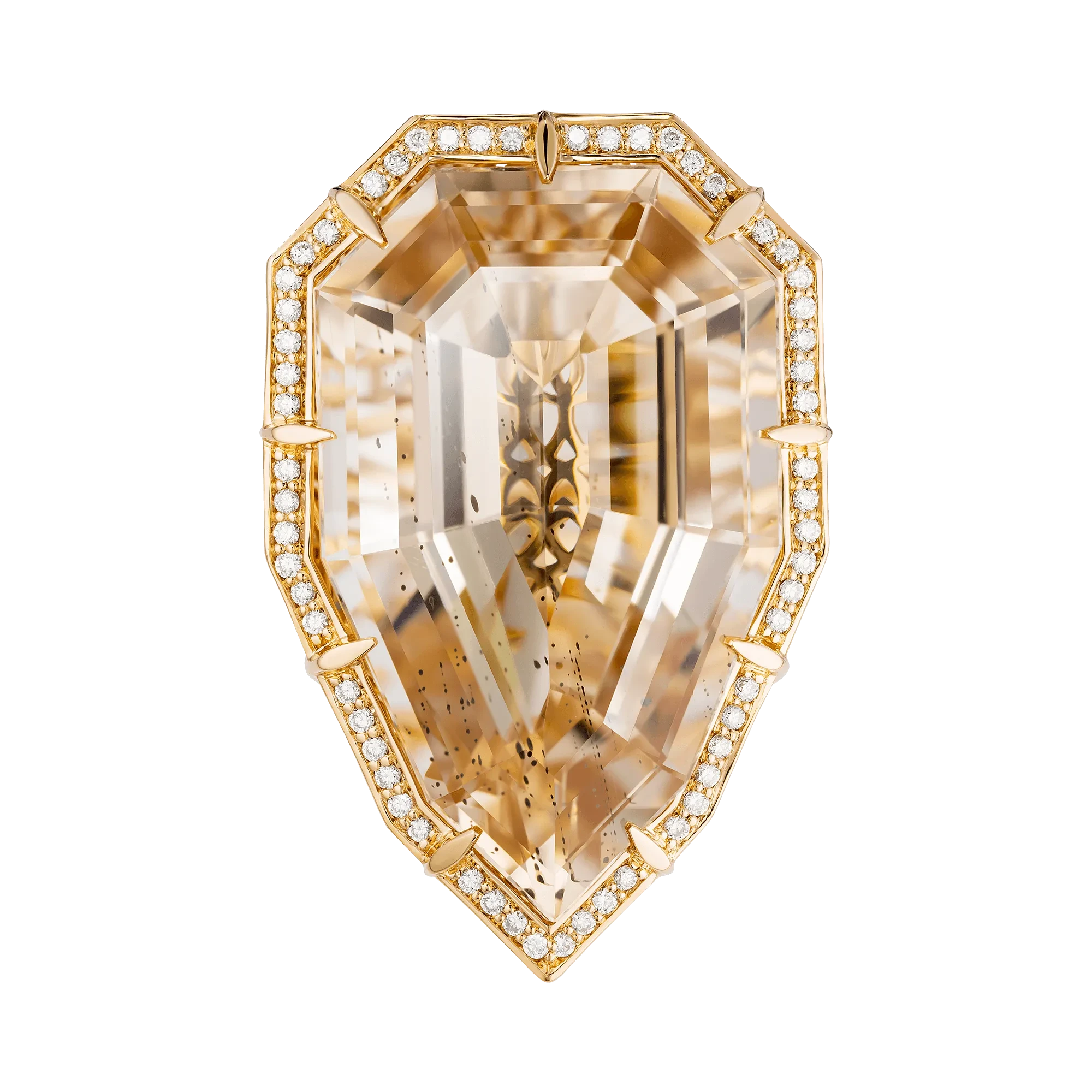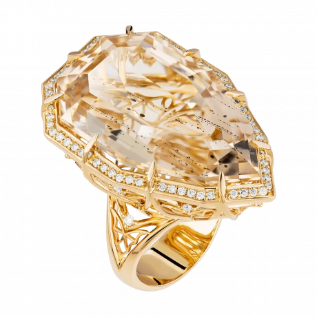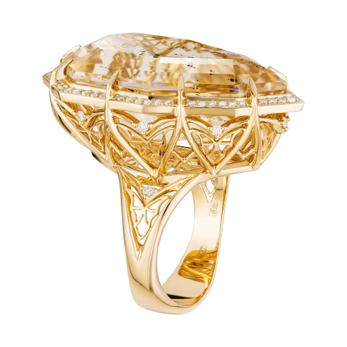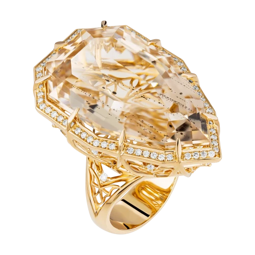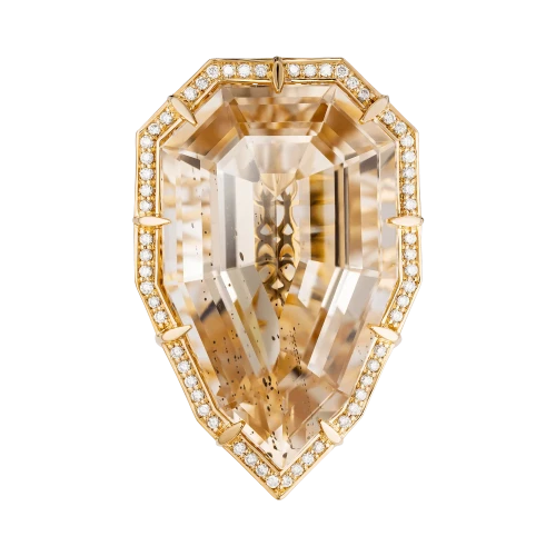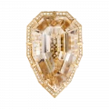 В центре композиции — скаполит весом 32,44 карата, редкий минерал, крайне редко встречающийся в ювелирных изделиях высокого уровня. Его прозрачная структура и тёплый золотистый оттенок формируют мягкое, глубокое свечение, наполняющее кристалл изнутри. Крупный размер усиливает это восприятие, переводя самоцвет в категорию коллекционных и делая его доминирующим элементом всей композиции.