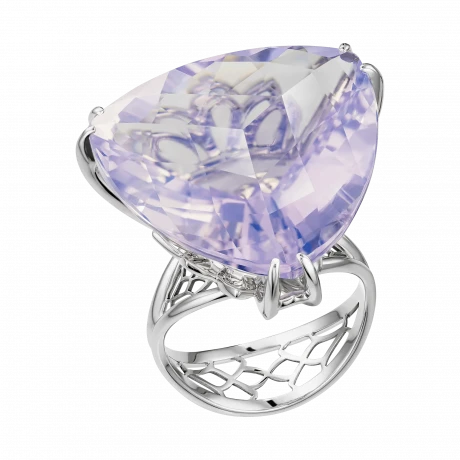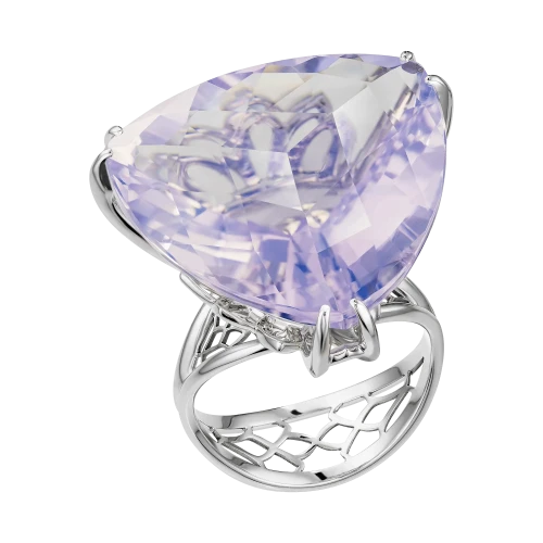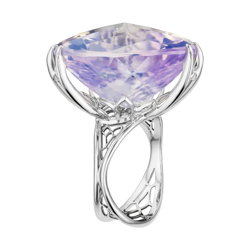 Ажурная оправа из белого золота словно создана, чтобы позволить свету и воздуху играть с кристаллом. Её изящная архитектура напоминает структуру сновидения – хрупкую, но совершенную. Природный камень будто парит над металлом, соединяя реальность и грёзы.