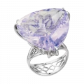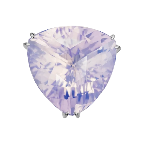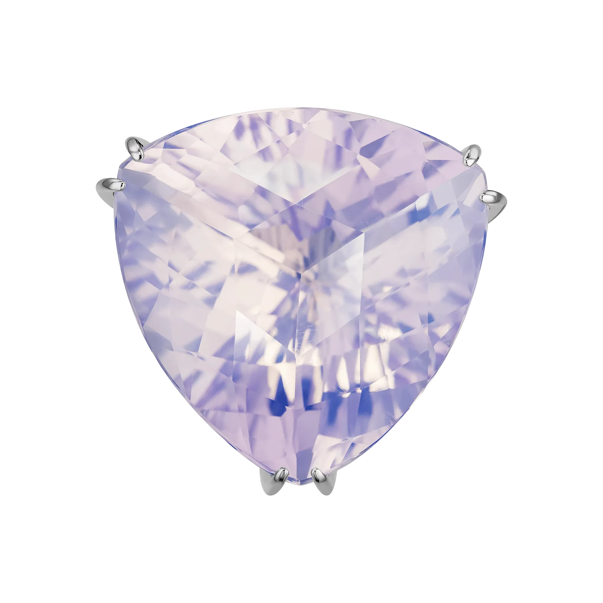 В центре композиции – лавандовый аметист весом 85,82 карата, природный камень редкого оттенка, сочетающего нежность сирени и прохладу утреннего света. Его прозрачность и тонкое внутреннее свечение создают ощущение лёгкости. Такой оттенок встречается исключительно в аметистах высшего класса, добытых на ограниченных месторождениях Южной Америки.