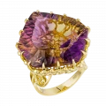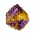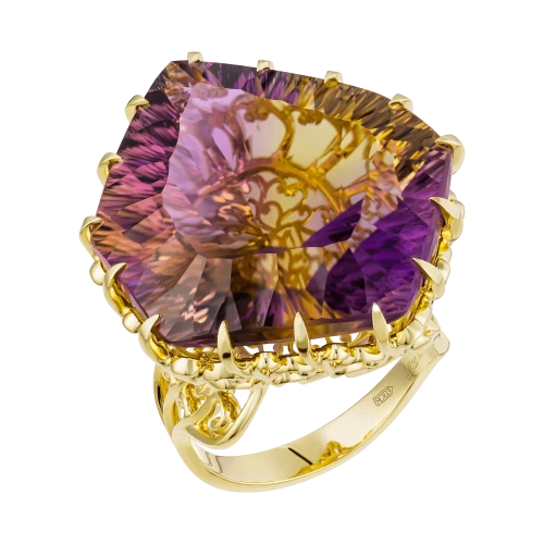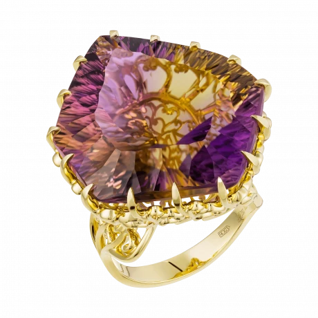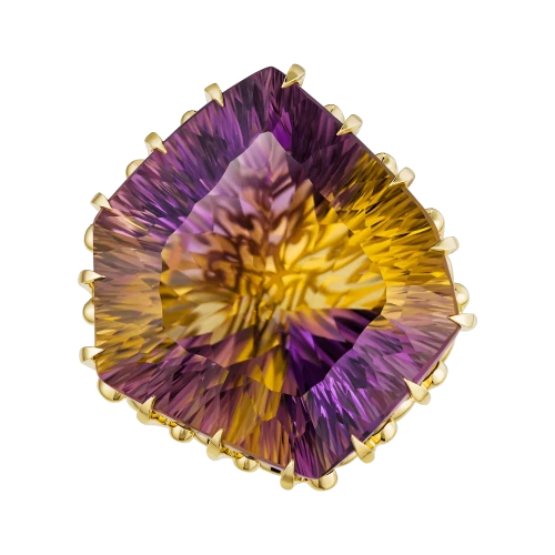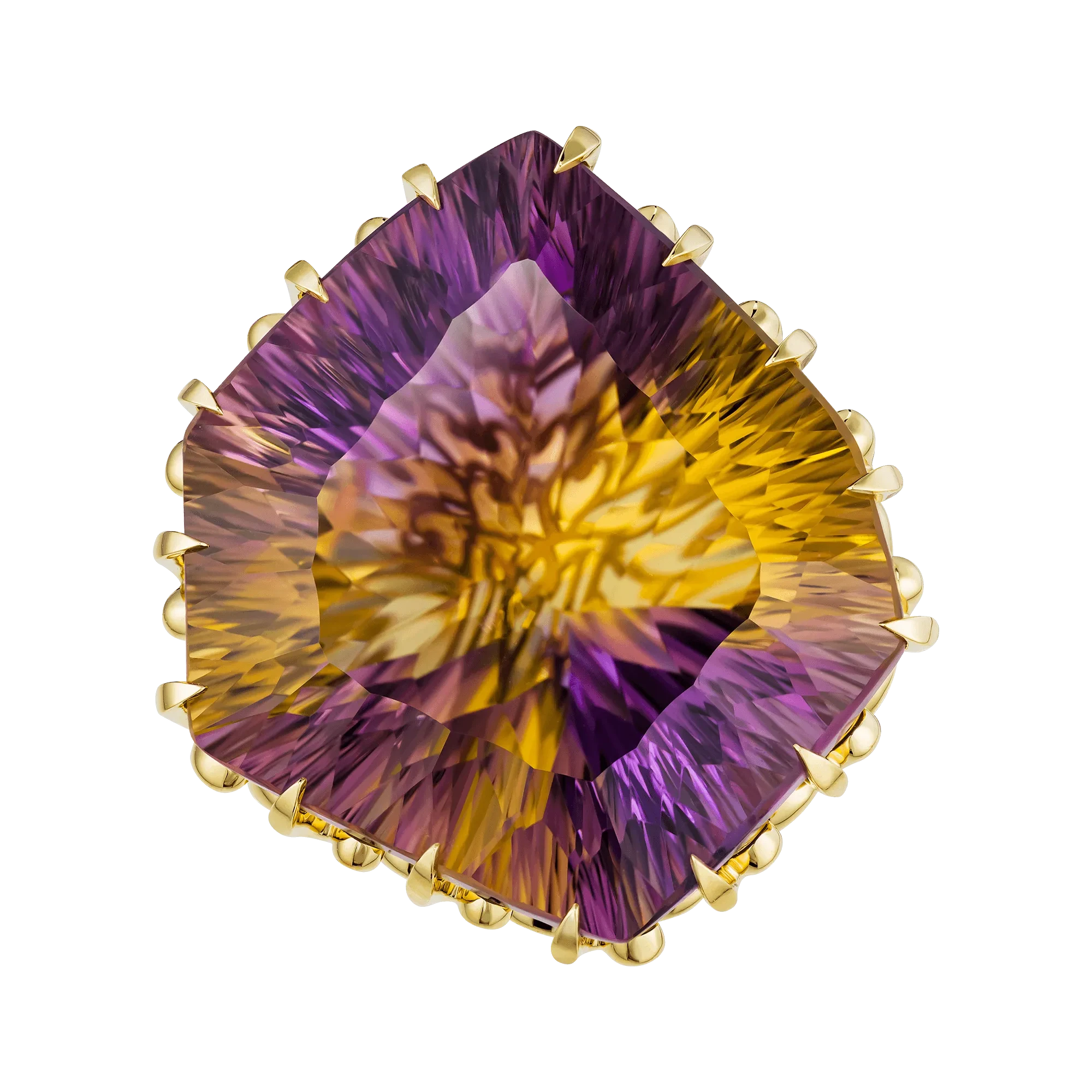В центре композиции — боливийский аметрин весом 40,83 карата, природный минерал, сочетающий в себе фиолетовые оттенки аметиста и золотистые тона цитрина. Такая двойственность возникает благодаря природным условиям формирования кристалла, где температурные изменения создают естественное разделение цвета. Фантазийная огранка усиливает этот эффект, позволяя свету проходить через разные зоны камня и раскрывать сложную игру оттенков, в которой цвета словно перетекают друг в друга.