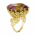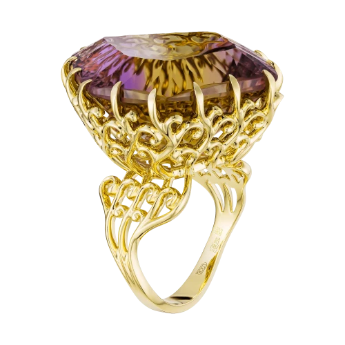 Оправа из жёлтого золота выстроена в открытой ажурной архитектуре, благодаря которой металл становится частью световой композиции. Линии, просвечивающие сквозь площадку самоцвета, создают дополнительный уровень глубины и подчёркивают его объём. Конструкция не ограничивает камень, а взаимодействует с ним, усиливая ощущение лёгкости и объединяя форму, свет и цвет в единое художественное пространство.