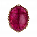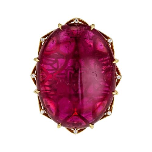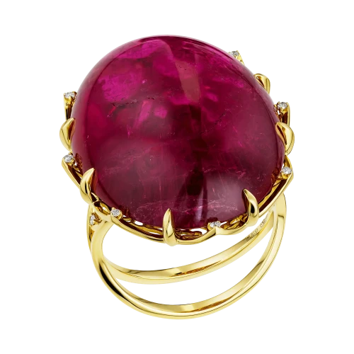 В ювелирной композиции рубеллит раскрыт как само воплощение внутренней силы — насыщенной, открытой и бескомпромиссной. Ярко-малиновый оттенок самоцвета относится к числу наиболее ценных цветовых проявлений турмалина и высоко ценится на международном рынке за редкость, глубину тона и эмоциональную выразительность. Африканское происхождение камня подчёркивает его характер: горячий, интенсивный, лишённый полутонов.