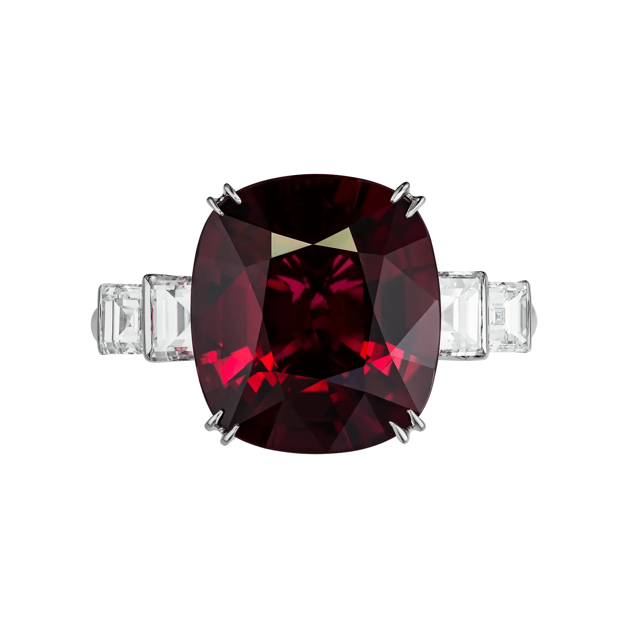 Геометричные бриллианты по сторонам центрального камня работают как архитектурные опоры, подчёркивая симметрию и усиливая ощущение порядка. Платиновая оправа задаёт холодный, сдержанный ритм композиции, создавая идеальный фон для раскрытия цвета шпинели и подчёркивая статус украшения. В символическом контексте шпинель нередко связывают с числом четыре — знаком стабильности, защиты и процветания, что находит отражение в строгой геометрии кольца.