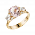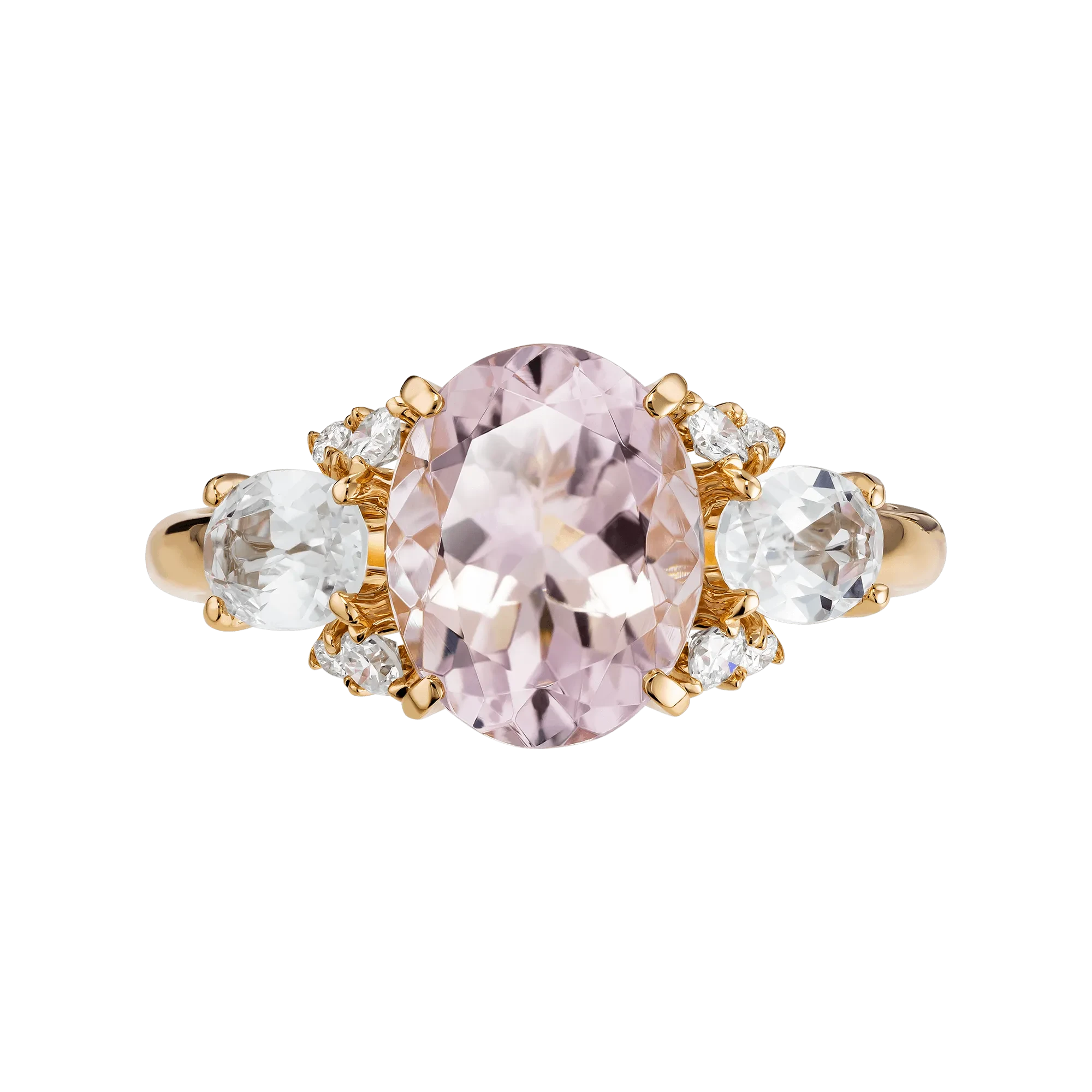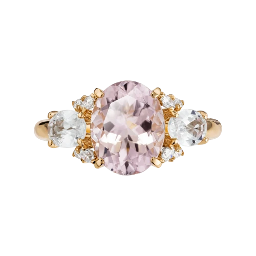 Боковые камни из белых сапфиров и бриллиантов усиливают игру света и придают композиции ритм и лёгкость. Оправа из жёлтого золота формирует тёплый, благородный контраст, подчёркивая мягкость оттенка центрального камня и связывая все элементы в гармоничное целое.