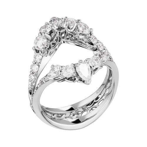 Белое золото, расшитое бриллиантами, становится фоном для внутреннего сияния, усиливая его звучание и добавляя образу светлой утончённости. «Таинственный нюанс» – это кольцо, в котором воплощена философия отношений и самой жизни: единство и свобода, союз и самостоятельность, свет и тень, переплетённые в гармонии.