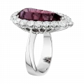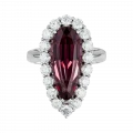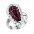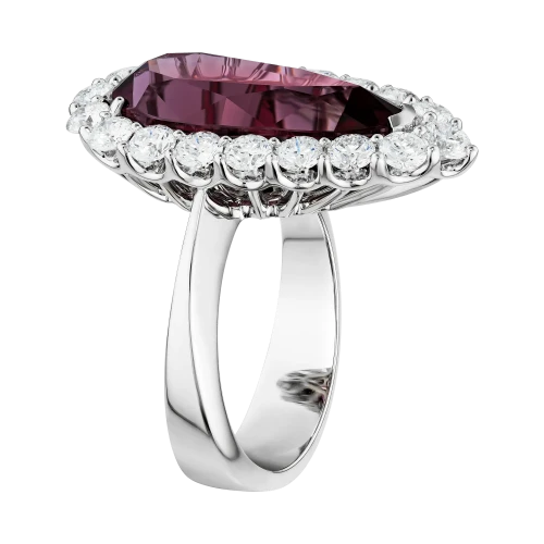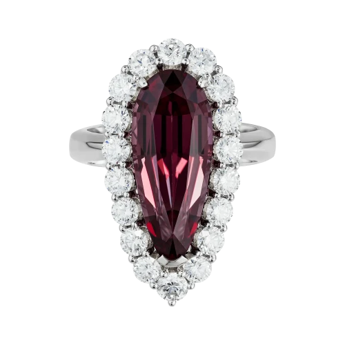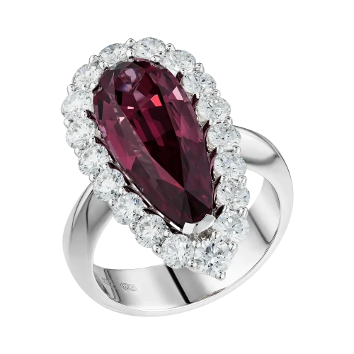 Огранка в форме капли подчёркивает внутренний характер самоцвета, словно фиксируя мгновение перехода между пламенем и тенью. Ореол из бриллиантов усиливает ощущение загадочности, создавая чистый световой контраст. Белое золото оправы становится нейтральным фоном, подчёркивая глубину оттенков и объём формы, и выстраивает гармоничный баланс между силой центрального камня и тонкой игрой сияющих граней.