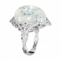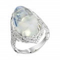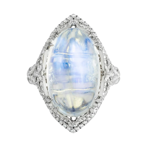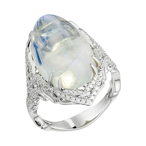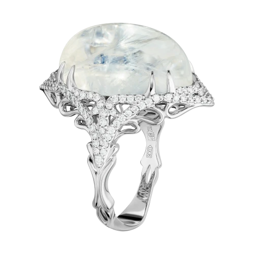 Загадочное кольцо «Там, где дышит ночь» построено вокруг редкого оптического явления, которое веками завораживало ювелиров и коллекционеров. В центре композиции — индийский лунный камень весом 16,70 карат, известный выраженной адуларесценцией — мягким внутренним свечением, словно скользящим под поверхностью минерала.