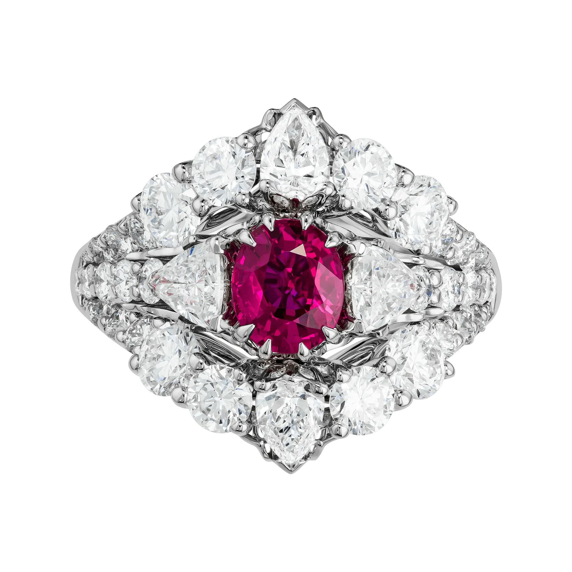 Кольцо выполнено в формате трансформируемого ювелирного объекта, допускающего смену художественного масштаба. В раскрытой, коктейльной конфигурации композиция приобретает экспрессивный характер: центральный рубин насыщенного алого оттенка, добытый на месторождении Мозамбика, доминирует в пространстве, окружённый сложным ореолом бриллиантов различной огранки. Их многоуровневая световая структура формирует динамичную среду, в которой цвет воспринимается как движущаяся энергия.