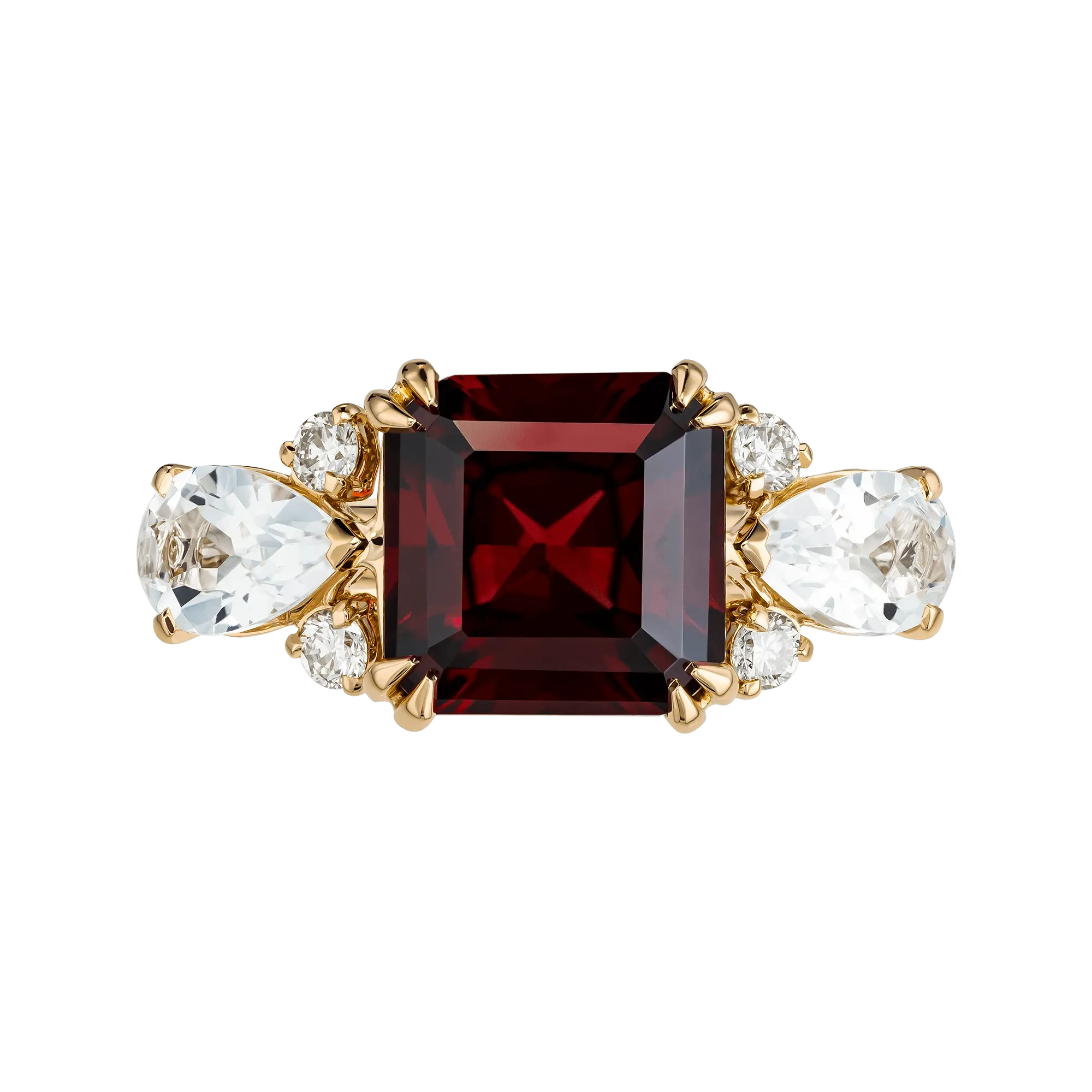 По обе стороны от центрального камня расположены прозрачные топазы и бриллианты, формирующие световые акценты. Их сияние смягчает графичность граната и добавляет композиции лёгкости и объёма.