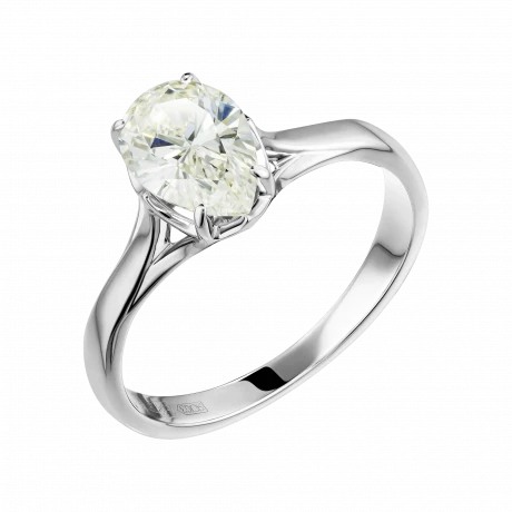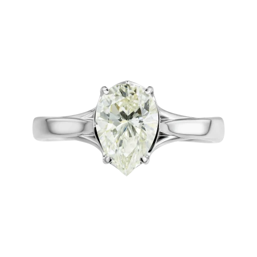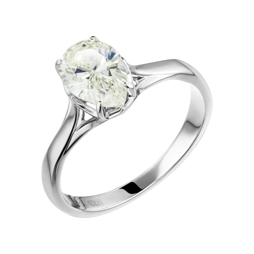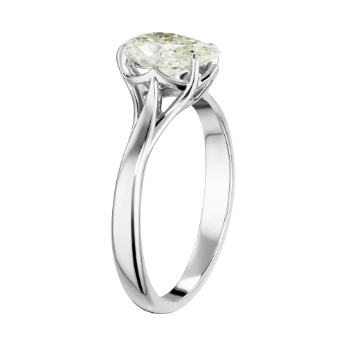 Оправа из белого золота выстроена как лаконичная архитектурная конструкция: тонкие линии приподнимают драгоценный камень, обеспечивая максимальный доступ света и подчёркивая его прозрачность. Контраст холодного блеска металла и тёплого сияния бриллианта формирует гармоничное равновесие — сдержанное, благородное и современное.