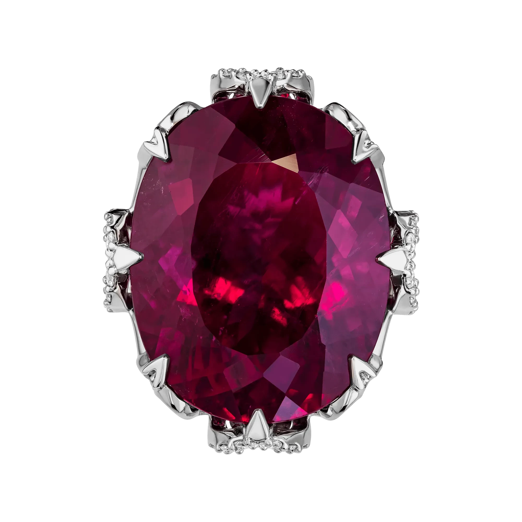 Кольцо «Трепет алого огня» создано мастерами Maxim Demidov как воплощение готической экспрессии и эмоциональной силы. Центральный рубеллит весом 18,09 карат из Бразилии пылает глубоким малиновым светом, словно сердце, наполненное драмой и страстью. Его насыщенный оттенок ассоциируется с пламенем, которое живёт в вечности – непокорным и свободным.