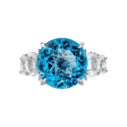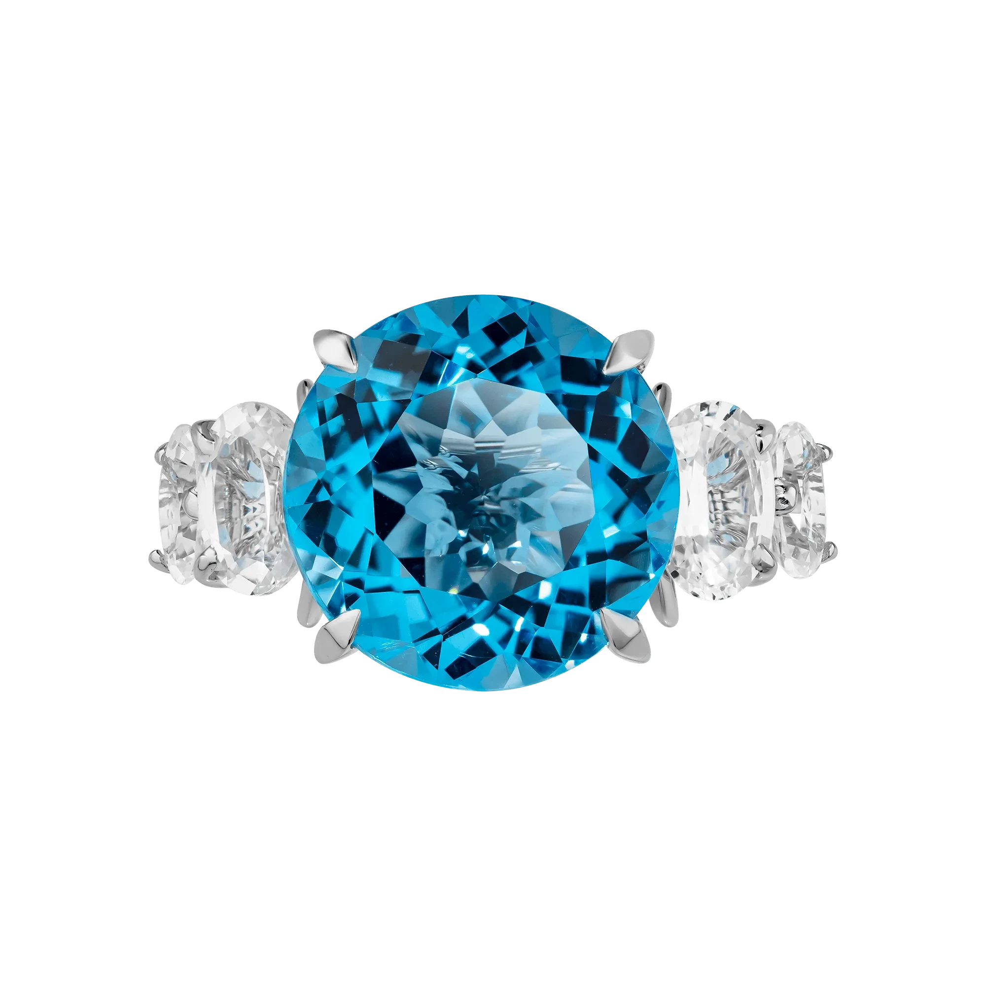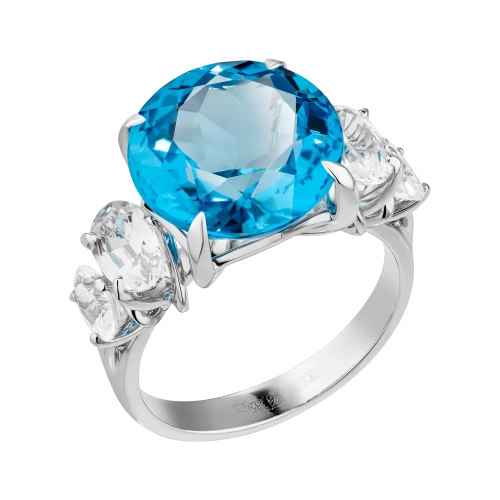 Близость топаза и прозрачных корундов подчеркивает насыщенный оттенок центрального кристалла, способного привлечь внимание к даме, даже если она просто идет по улице в солнечных лучах.