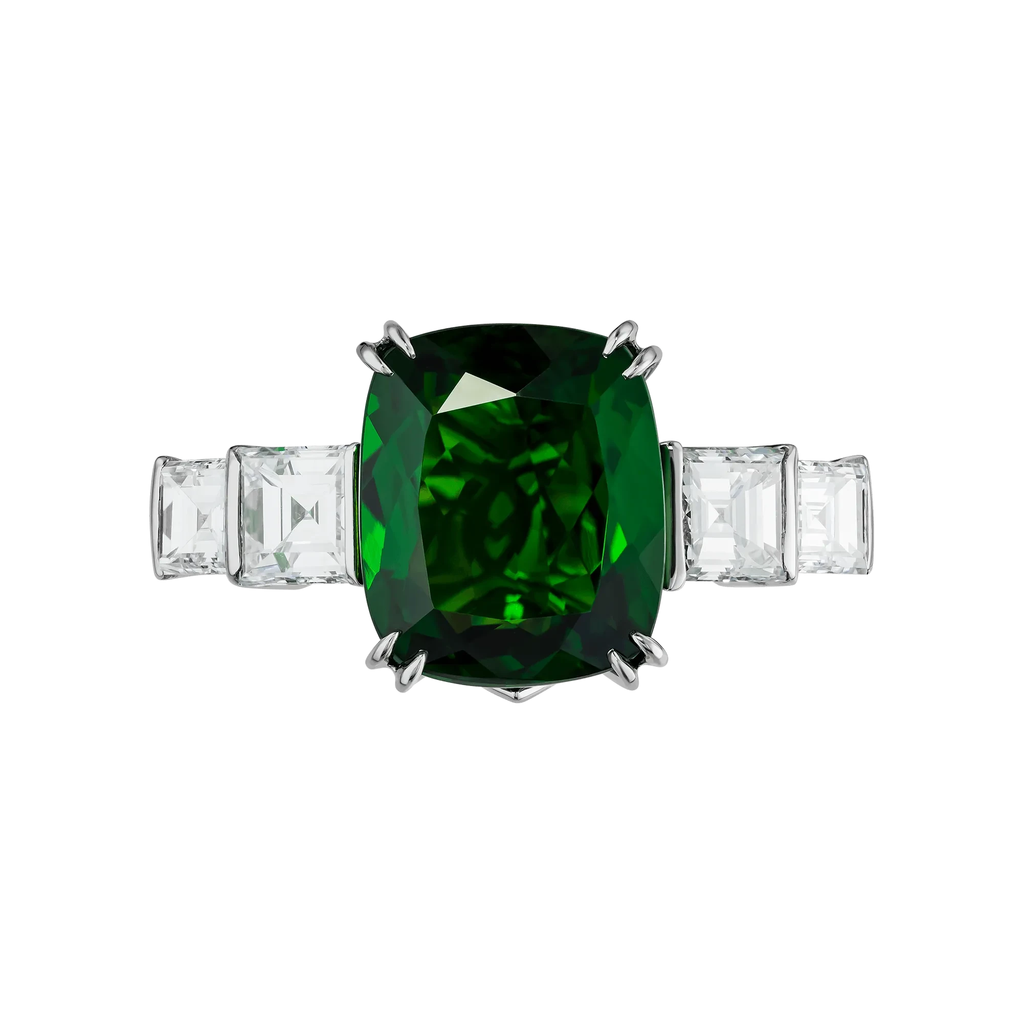 Графичная оправа из платины подчёркивает характер центрального тсаворита: металл выбран за свою редкость, устойчивость и статус одного из самых надёжных ювелирных материалов. Квадратные бриллианты выстроены как архитектурные опоры, усиливая строгость композиции и подчёркивая геометрию формы.