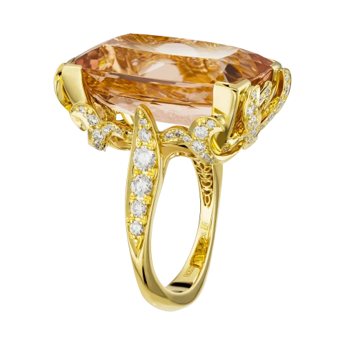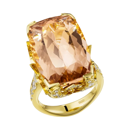 Оправa из жёлтого золота, инкрустированная бриллиантами, словно обнимает камень, поддерживая его в пространстве – надёжно, но невесомо. В этом контрасте силы и мягкости рождается ощущение гармонии, когда свет и эмоция становятся единым дыханием.